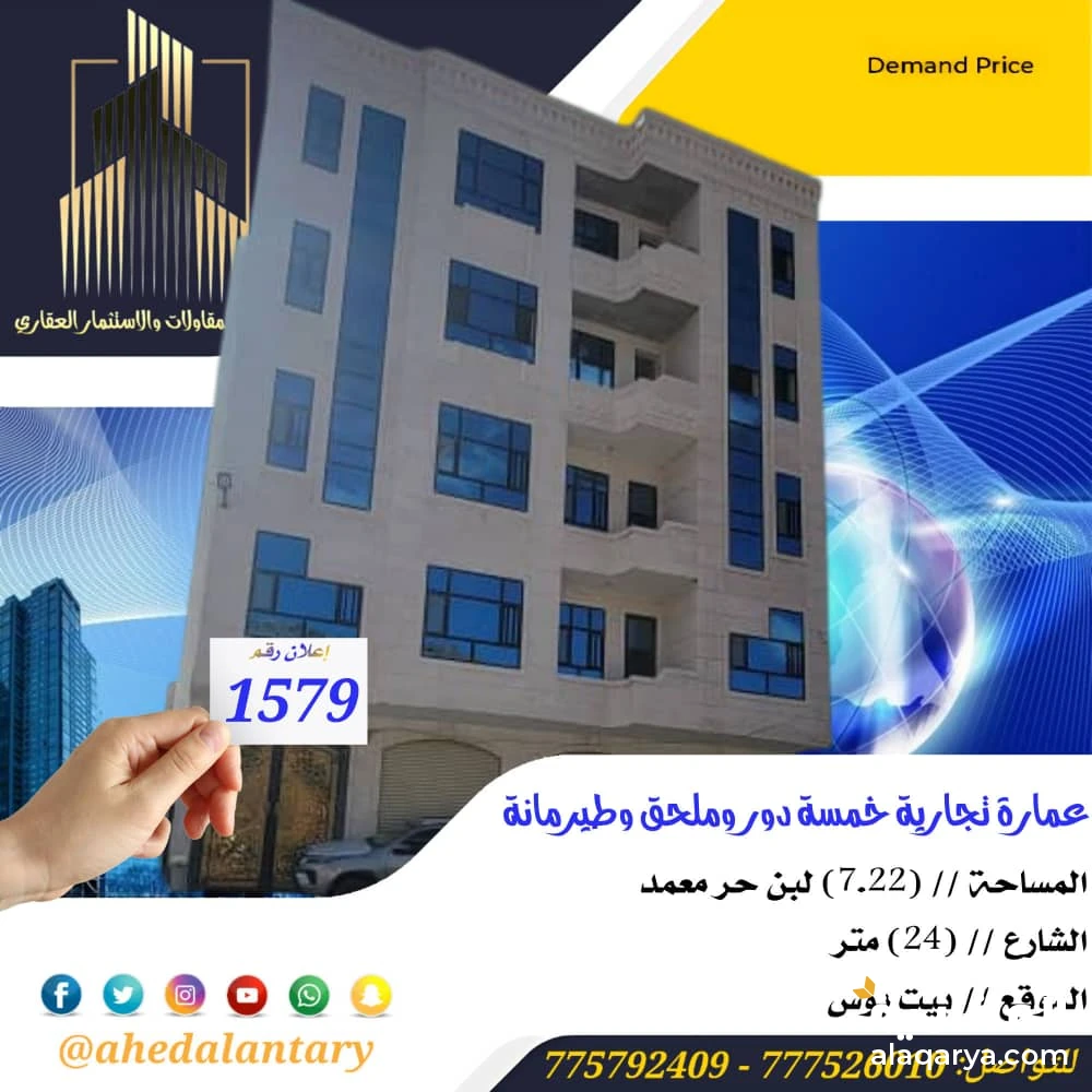 عرض رقم (1579) عمارة تجارية vip خمسة دور وملحق وطيرمانة سوبر لوكس عشر شقق اربع شقق مفروشة.. المساحة // (7.22) لبن حر معمد في السجل العقاري.. الشارع // (24) متر.. الموقع // بيت بوس.. السعر // (1,200,000 $) مليون ومائتين الف دولار قابل للتفاوض.. التفاصيل: عمارة تجارية vip خمسة دور وملحق وطيرمانة سوبر لوكس اربع شقق مفروشة.. - الدور الاول يتكون من ثلاث فتحات تجارية مع ثلاثة حمامات وجراش سيارة ومدخل خاص وخزان ارضي وشقة في الخلف تتكون من (جناح عائلي غرف نوم مع الحمام) وغرفتين وصالة معيشة وحمام ومطبخ بمدخل عائلي ومجلس وحمام بمدخل مستقل.. - الدور الثاني يتكون من شقتين كبار كل شقة تتكون من (جناح عائلي غرف نوم مع الحمام) وغرفتين وصالة معيشة وبلكونة وحمام ومطبخ بمدخل عائلي ومجلس وحمام بمدخل مستقل.. - الدور الثالث والدور الرابع والدور الخامس نفس تصميم الدور الثاني.. 💫 صممت الأساسات لتحمل عدد ستة دور وملحق وطيرمانة.. 💫 بالإضافة إلى تشطيب سوبر لوكس.. 💫 جميع المواد المستخدمة درجة أولى.. 💫 بالإضافة إلى خزان ارضي يتسع ل خمسة وايتات.. 💫 بالإضافة إلى جراش سيارتين.. 💫 بالإضافة إلى واجهة شرقي.. 💫 بالإضافة إلى واجهة حجر.. 💫 بالإضافة إلى تهوية وحوش دوران .. 💫 بالإضافة إلى موقع قريب من جميع الخدمات.. 💫 توثيق كامل ( صور + فيديو ) لجميع مراحل العمل.. *وميزات اخرى ستتعرف عليها وستشاهدها عند زيارتك لها* """"""""""""""""""""""""""""""""""""""""" #العنتري_للمقاولات_والإستثمار_العقاري للتواصل: (777526010)📞 (775792409)📞 لمتابعة جميع عروضنا عبر صفحتنا على منصة الفيس بوك: https://www.facebook.com/antri.ye/ وللتواصل عبر الواتس مباشرة يرجى الضغط على الرابط التالي... https://wa.me/967775792409 للحصول على كل جديد في عالم العقارات تابعنا على قناة الواتساب.. https://whatsapp.com/channel/0029Va8yDxWGZNCzotxGlr1U رابط قناتنا على: youtube https://youtube.com/@ahedalantary 🔴 تنويه لعملائنا الكرام ومتابعينا الأعزاء يوجد لدينا مخزون هائل من العروض العقارية للفل والعمائر التجارية والمزارع والأرضي الإستثمارية العملاقة. 🔴 ملاحظة: جميع عقاراتنا من الملاك رأسا. 🔴 ملاحظة: الأسعار تتغير نتيجة لتفاوت أسعار الصرف والوضع الاقتصادي للبلد. 🌐🌐🌐🌐🌐🌐🌐🌐🌐🌐🌐🌐🌐🌐🌐🌐🌐🌐🌐