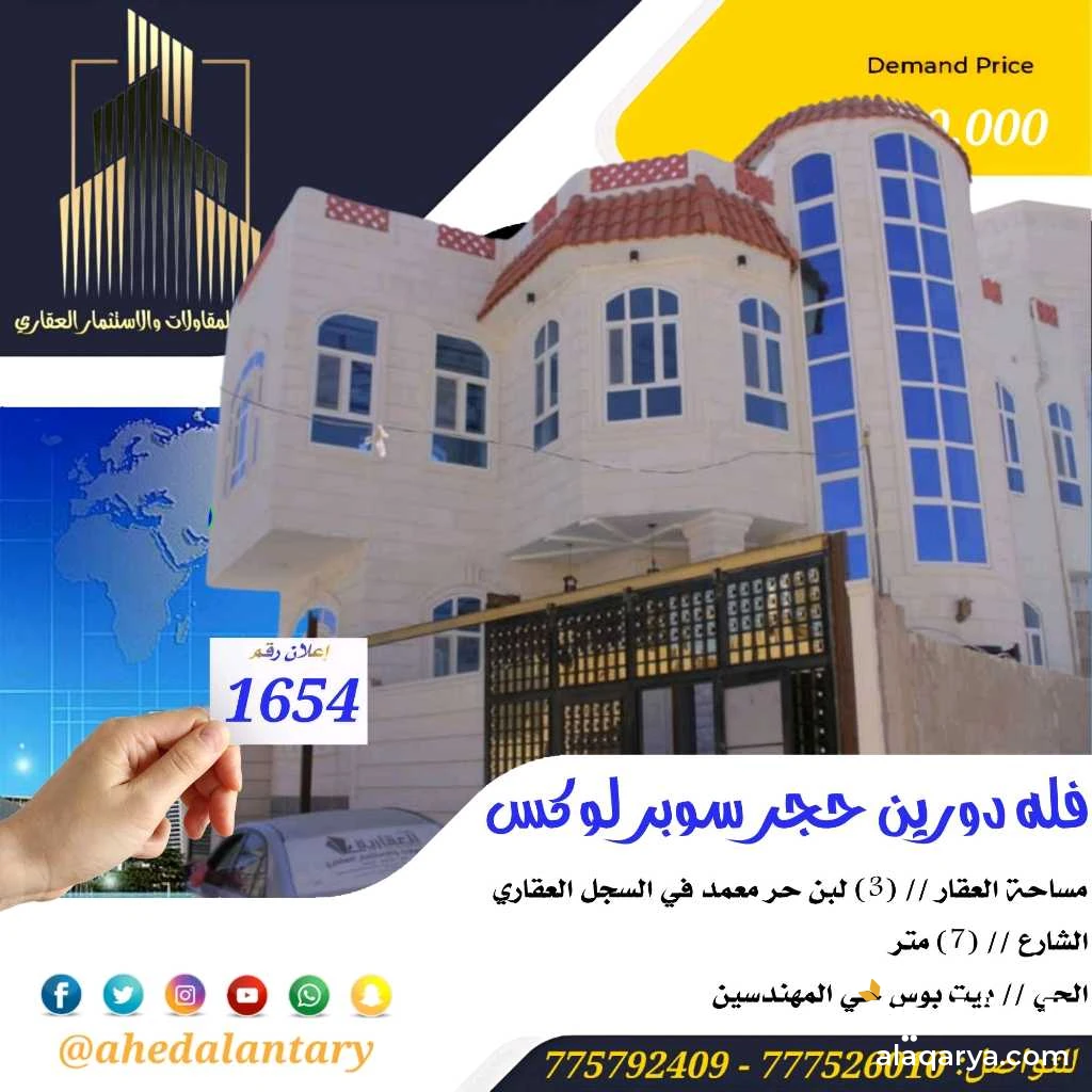 هل تعبت من البحث عن عقار مناسب لاستثمار اموالك فيه؟! .. هل احترت من اين تبدأ ؟! إليك الحل المناسب !! نقدم لكم عرض رقم// (1654) فله دورين حجر سوبر لوكس بسعر مناسب و مغري جدا.. مساحة العقار // (3) لبن حر معمد في السجل العقاري.. الشارع // (7) متر.. الحي // بيت بوس حي المهندسين.. السعر // (90,000,000) تسعين مليون ريال قابل للتفاوض.. التفاصيل: فلة دورين حجر سوبر لوكس بسعر مناسب و مغري جدا.. الدور الأول يتكون من مجلس وحمام وصالة ومطبخ وغرفة وصالة وحمام.. الدور الثاني يتكون من جناح عائلي + صالة + غرفتين وحمام وصالة.. الفلة تحتوي على حوش للسيارة + خزان أرضي.. ☑ بالإضافة إلى خزان ارضي.. ☑ بالإضافة إلى حوش سيارة.. ☑ بالإضافة إلى واجهة حجر.. ☑ بالإضافة إلى تشطيب سوبر ديلوكس.. ☑ التصميم فيهن من التصاميم الحديثة.. ☑ كما انها مؤسسة ل اربعة دور.. *ملاحظة // المفاتيح معي في اي وقت تشتي تدخل الفلة* رابط الفيديو على اليوتيوب https://youtu.be/dbialvGBmFQ?si=xDujKQiZFq_tp8V6 *وميزات اخرى ستتعرف عليها وستشاهدها عند زيارتك لها* """"""""""""""""""""""""""""""""""""""""" #العنتري_للمقاولات_والإستثمار_العقاري للتواصل: (777526010)📞 (775792409)📞 لمتابعة جميع عروضنا عبر صفحتنا على منصة الفيس بوك: https://www.facebook.com/antri.ye/ وللتواصل عبر الواتس مباشرة يرجى الضغط على الرابط التالي... https://wa.me/967775792409 للحصول على كل جديد في عالم العقارات تابعنا على قناة الواتساب.. https://whatsapp.com/channel/0029Va8yDxWGZNCzotxGlr1U رابط قناتنا على: youtube https://youtube.com/@ahedalantary 🔴 تنويه لعملائنا الكرام ومتابعينا الأعزاء يوجد لدينا مخزون هائل من العروض العقارية للفل والعمائر التجارية والمزارع والأرضي الإستثمارية العملاقة. 🔴 ملاحظة: جميع عقاراتنا من الملاك رأسا. 🔴 ملاحظة: الأسعار تتغير نتيجة لتفاوت أسعار الصرف والوضع الاقتصادي للبلد. 🌐🌐🌐🌐🌐🌐🌐🌐🌐🌐🌐🌐🌐🌐🌐🌐🌐🌐🌐
