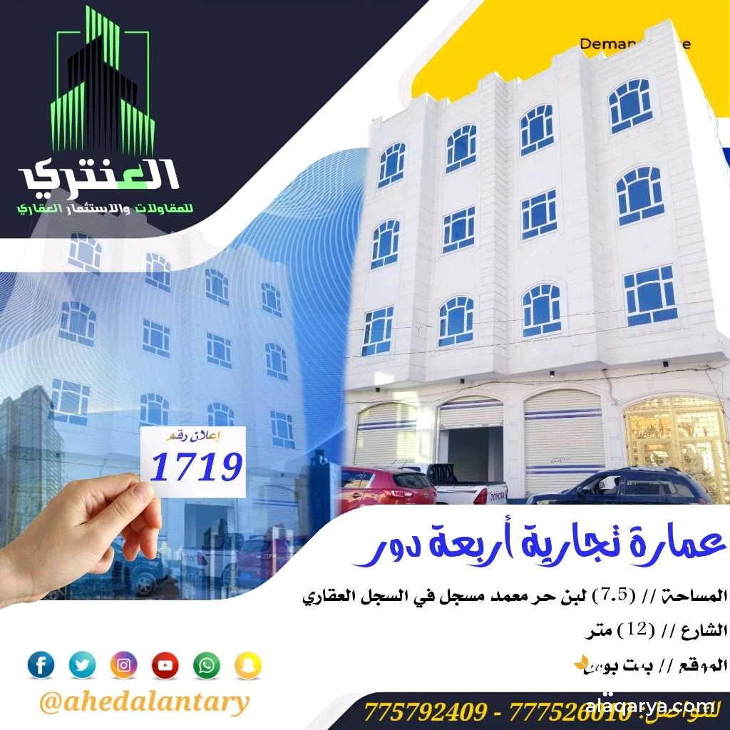 عرض رقم (1719) عمارة تجارية أربعة دور سوبر لوكس... المساحة // (7.5) لبن حر معمد مسجل في السجل العقاري.. الشارع // (12) متر.. الموقع // بيت بوس.. التفاصيل: عمارة تجارية أربعة دور سوبر لوكس... - الدور الاول يتكون من ثلاث فتحات تجارية وجراش ثلاث سيارات وخزان ارضي وشقة في الخلف تتكون من (جناح عائلي غرف نوم مع الحمام) وغرفتين وصالة معيشة وحمام ومطبخ بمدخل عائلي ومجلس وحمام وصالة بمدخل مستقل. - الدور الثاني يتكون من شقتين كل شقة تتكون من (جناح عائلي غرف نوم مع الحمام) وغرفتين وصالة معيشة وحمام ومطبخ بمدخل عائلي ومجلس وحمام وصالة بمدخل مستقل. - الدور الثالث والدور الرابع نفس تصميم الدور الثاني.. 💫 صممت الأساسات لتحمل عدد خمسة دور وملحق وطيرمانة.. 💫 قريبة جدا من الشارع العام والاسوق.. 💫 الاوراق معمدة وموثقة في السجل العقاري.. 💫 عمل كامل درجة اولى.. 💫 الموقع ارقئ واجمل الاحياء الراقي والجميلة في امانة العاصمة.. 💫 بالإضافة إلى تشطيب سوبر لوكس.. 💫 بالإضافة إلى اثنين خزان ارضي واسعة جدا.. 💫 بالإضافة إلى تهوية من جميع الجهات.. 💫 بالإضافة إلى جراش للسيارات.. 💫 بالإضافة إلى واجهة حجر.. 💫 توثيق كامل ( صور + فيديو ) لجميع مراحل العمل.. *وميزات اخرى ستتعرف عليها وستشاهدها عند زيارتك لها* """"""""""""""""""""""""""""""""""""""""" #العنتري_للمقاولات_والإستثمار_العقاري للتواصل: (777526010)📞 (775792409)📞 لمتابعة جميع عروضنا عبر صفحتنا على منصة الفيس بوك: https://www.facebook.com/antri.ye/ وللتواصل عبر الواتس مباشرة يرجى الضغط على الرابط التالي... https://wa.me/967775792409 للحصول على كل جديد في عالم العقارات تابعنا على قناة الواتساب.. https://whatsapp.com/channel/0029Va8yDxWGZNCzotxGlr1U رابط قناتنا على: youtube https://youtube.com/@ahedalantary 🔴 تنويه لعملائنا الكرام ومتابعينا الأعزاء يوجد لدينا مخزون هائل من العروض العقارية للفل والعمائر التجارية والمزارع والأرضي الإستثمارية العملاقة. 🔴 ملاحظة: جميع عقاراتنا من الملاك رأسا. 🔴 ملاحظة: الأسعار تتغير نتيجة لتفاوت أسعار الصرف والوضع الاقتصادي للبلد. 🌐🌐🌐🌐🌐🌐🌐🌐🌐🌐🌐🌐🌐🌐🌐🌐🌐🌐🌐