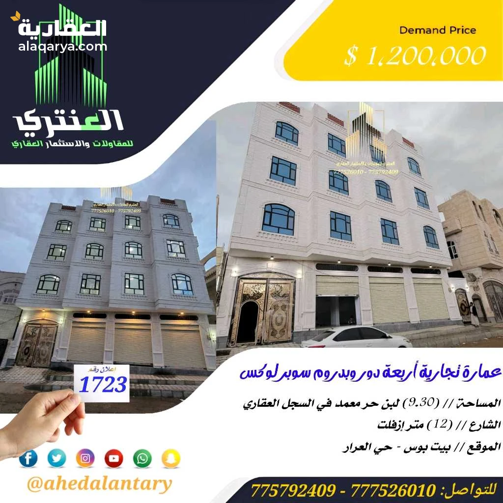 عرض رقم (1723) عمارة تجارية أربعة دور وبدروم سوبر لوكس.. المساحة // (9.30) لبن حر معمد في السجل العقاري.. الشارع // (12) متر إزفلت.. الموقع // بيت بوس - حي العرار.. السعر // (1,200,000) مليون ومائتين الف دولار قابل للتفاوض.. التفاصيل: عمارة تجارية أربعة دور وبدروم سوبر لوكس.. - البدروم مفتوح كامل تهوية واضائة من جميع الجهات.. - الدور الاول يتكون من ثلاث فتحات تجارية وجراش للسيارات ومدخل من الشارع منفصل وخزان ارضي وشقة في الخلف تتكون من ثلاث غرف ومطبخ وحمام وصالة بمدخل عائلي ومجلس وحمام بمدخل مستقل.. - الدور الثاني يتكون من شقتين كل شقة تتكون من (جناح عائلي غرف نوم مع الحمام) و غرفتين وصالة وحمام ومطبخ بمدخل عائلي ومجلس وحمام وصالة بمدخل مستقل.. - الدور الثالث والدور الرابع نفس تصميم الدور الثاني.. 💫 صممت الأساسات لتحمل عدد ستة دور وملحق وطيرمانة.. 💫 بالإضافة إلى تشطيبات سوبر لوكس.. 💫 عمل كامل درجة اولى.. 💫 بالإضافة إلى موقع ذهبي.. 💫 جميع المواد المستخدمة درجة أولى.. 💫 بالإضافة إلى خزان ارضي يتسع ل ستة وايتات.. 💫 بالإضافة إلى جراش يتسع ل أربع سيارات.. 💫 بالإضافة إلى حوش دوران.. 💫 بالإضافة إلى واجهة حجر.. 💫 بالإضافة إلى توثيق كامل ( صور + فيديو ) لجميع مراحل العمل.. *وميزات اخرى ستتعرف عليها وستشاهدها عند زيارتك لها* """"""""""""""""""""""""""""""""""""""""" #العنتري_للمقاولات_والإستثمار_العقاري للتواصل: (777526010)📞 (775792409)📞 لمتابعة جميع عروضنا عبر صفحتنا على منصة الفيس بوك: https://www.facebook.com/antri.ye/ وللتواصل عبر الواتس مباشرة يرجى الضغط على الرابط التالي... https://wa.me/967775792409 للحصول على كل جديد في عالم العقارات تابعنا على قناة الواتساب.. https://whatsapp.com/channel/0029Va8yDxWGZNCzotxGlr1U رابط قناتنا على: youtube https://youtube.com/@ahedalantary 🔴 تنويه لعملائنا الكرام ومتابعينا الأعزاء يوجد لدينا مخزون هائل من العروض العقارية للفل والعمائر التجارية والمزارع والأرضي الإستثمارية العملاقة. 🔴 ملاحظة: جميع عقاراتنا من الملاك رأسا. 🔴 ملاحظة: الأسعار تتغير نتيجة لتفاوت أسعار الصرف والوضع الاقتصادي للبلد. 🌐🌐🌐🌐🌐🌐🌐🌐🌐🌐🌐🌐🌐🌐🌐🌐🌐🌐🌐