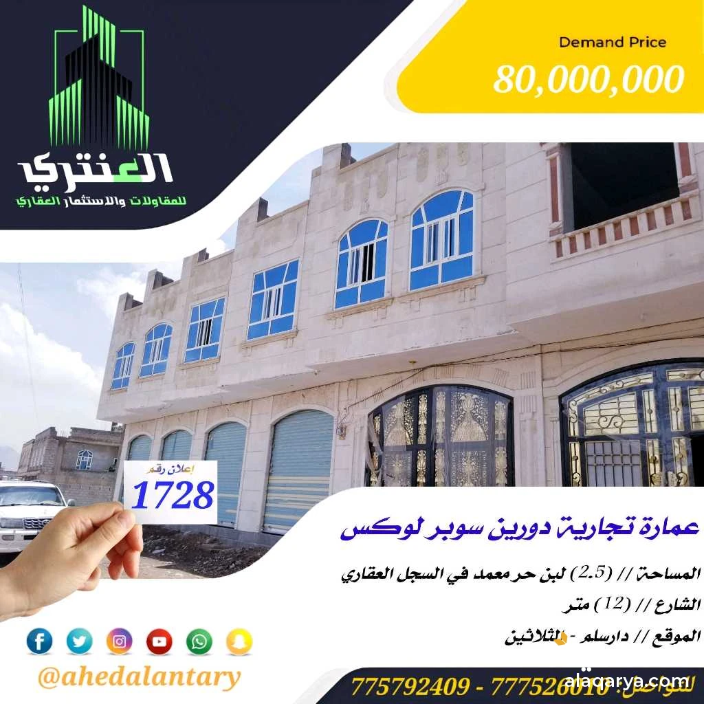 هل تعبت من البحث عن عقار مناسب لاستثمار اموالك فيه؟! .. هل احترت من اين تبدأ ؟! إليك الحل المناسب !! نقدم لكم: عرض رقم (1728) عمارة تجارية دورين مشطب تشطيب سوبر لوكس.. المساحة // (2.5) لبن حر معمد في السجل العقاري.. الشارع // (12) متر.. الموقع // دارسلم - الثلاثين.. السعر // (80,000,000) ثمانين مليون ريال.. التفاصيل: عمارة تجارية دورين سوبر لوكس... - الدور الاول يتكون من أربعة فتحات تجارية وجراش سيارة وخزان ارضي.. - الدور الثاني يتكون من شقة كبيره نظام فلة تتكون من (جناح عائلي غرف نوم مع الحمام) و غرفتين وصالة استقبال وصالة جانبية وحمام ومطبخ بمدخل عائلي ومجلس وحمام وصالة بمدخل مستقل.. *مميزاتها* *💫 صممت الأساسات لتحمل عدد خمسة دور وطيرمانة..* *💫 بالإضافة إلى تشطيب سوبر ديلوكس..* *💫 تأسيسات الكهرباء و السباكة درجة أولى..* *💫 بالإضافة إلى واجهة حجر..* *💫 جميع المواد المستخدمة درجة أولى..* *💫 بالإضافة إلى خزان ارضي يتسع ل اربعة وايتات..* *💫 كما انها قريبة جدآ من شارع تعز وشارع الاربعين..* *💫 توثيق كامل ( صور + فيديو ) لجميع مراحل العمل..* *وميزات اخرى ستتعرف عليها وستشاهدها عند زيارتك لها* """"""""""""""""""""""""""""""""""""""""" #العنتري_للمقاولات_والإستثمار_العقاري للتواصل: (777526010)📞 (775792409)📞 لمتابعة جميع عروضنا عبر صفحتنا على منصة الفيس بوك: https://www.facebook.com/antri.ye/ وللتواصل عبر الواتس مباشرة يرجى الضغط على الرابط التالي... https://wa.me/967775792409 للحصول على كل جديد في عالم العقارات تابعنا على قناة الواتساب.. https://whatsapp.com/channel/0029Va8yDxWGZNCzotxGlr1U رابط قناتنا على: youtube https://youtube.com/@ahedalantary 🔴 تنويه لعملائنا الكرام ومتابعينا الأعزاء يوجد لدينا مخزون هائل من العروض العقارية للفل والعمائر التجارية والمزارع والأرضي الإستثمارية العملاقة. 🔴 ملاحظة: جميع عقاراتنا من الملاك رأسا. 🔴 ملاحظة: الأسعار تتغير نتيجة لتفاوت أسعار الصرف والوضع الاقتصادي للبلد. 🌐🌐🌐🌐🌐🌐🌐🌐🌐🌐🌐🌐🌐🌐🌐🌐🌐🌐🌐