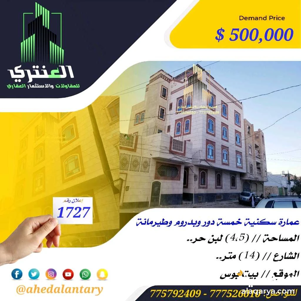 عرض رقم (1727) عمارة سكنية خمسة دور وبدروم وطيرمانة.. المساحة // (4,5) لبن حر.. الشارع // (14) متر.. الموقع // بيت بوس التفاصيل: عمارة سكنية خمسة دور وبدروم وطيرمانة.. - البدروم يتكون من خمس عرف كبار وصالة كبيره جدا وحمامين ومطبخ.. - الدور الأول يتكون من شقتين كل شقة تتكون من غرفتين وصالة وحمام ومطبخ ومجلس وحمام.. - الدور الثاني والدور الثالث نفس تصميم الدور الاول.. - الدور الرابع يتكون من شقة كبيره نظام فلة تتكون من (جناح عائلي غرف نوم مع الحمام) وغرفة اطفال وغرفة جلوس وغرفة استقبال الضيوف وصالة ثمانية في أربعة سوبر لوكس ومجلس نساء كبير وحمام بمدخل عائلي ومجلس وحمام بمدخل مستقل.. - الدور الخامس يتكون من شقة تتكون من غرفتين وصالة وحمام ومطبخ كبير ومجلسوحمام والباقي سطح.. - الدور السادسة الطيرمانة.. 💫 صممت الأساسات لتحمل عدد ستة دور وطيرمانة.. 💫 قريبة جدا من الشارع العام والاسوق.. 💫 الاوراق معمدة وموثقة في السجل العقاري.. 💫 عمل كامل درجة اولى.. 💫 الموقع ارقئ واجمل الاحياء الراقي والجميلة في امانة العاصمة.. 💫 بالإضافة إلى خزان ارضي يتسع ل (18,000) الف لتر.. 💫 بالإضافة إلى تهوية من جميع الجهات.. 💫 بالإضافة إلى واجهة عدني (جنوبي).. 💫 بالإضافة إلى واجهتين حجر.. 💫 توثيق كامل ( صور + فيديو ) لجميع مراحل العمل.. *وميزات اخرى ستتعرف عليها وستشاهدها عند زيارتك لها* """"""""""""""""""""""""""""""""""""""""" #العنتري_للمقاولات_والإستثمار_العقاري للتواصل: (777526010)📞 (775792409)📞 لمتابعة جميع عروضنا عبر صفحتنا على منصة الفيس بوك: https://www.facebook.com/antri.ye/ وللتواصل عبر الواتس مباشرة يرجى الضغط على الرابط التالي... https://wa.me/967775792409 للحصول على كل جديد في عالم العقارات تابعنا على قناة الواتساب.. https://whatsapp.com/channel/0029Va8yDxWGZNCzotxGlr1U رابط قناتنا على: youtube https://youtube.com/@ahedalantary 🔴 تنويه لعملائنا الكرام ومتابعينا الأعزاء يوجد لدينا مخزون هائل من العروض العقارية للفل والعمائر التجارية والمزارع والأرضي الإستثمارية العملاقة. 🔴 ملاحظة: جميع عقاراتنا من الملاك رأسا. 🔴 ملاحظة: الأسعار تتغير نتيجة لتفاوت أسعار الصرف والوضع الاقتصادي للبلد. 🌐🌐🌐🌐🌐🌐🌐🌐🌐🌐🌐🌐🌐🌐🌐🌐🌐🌐🌐