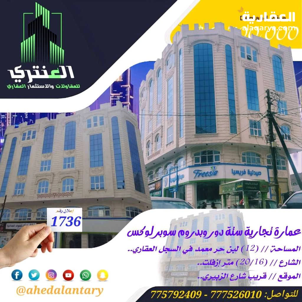 عرض رقم (1736) عمارة تجارية ستة دور وبدروم سوبر لوكس.. المساحة // (12) لبن حر معمد في السجل العقاري.. الشارع // (20/16) متر إزفلت.. الموقع // قريب شارع الزبيري.. السعر // (2,700,000 $) أثنين مليون وسبعمائة الف دولار قابل للتفاوض.. التفاصيل: عمارة تجارية ستة دور وبدروم سوبر لوكس.. - البدروم مفتوح كامل.. - الدور الاول يتكون من ثمان فتحات تجارية مع فتحة للبدروم وحوش واسع للسيارات وخزان ارضي وشقة في الخلف تتكون من (جناح عائلي غرف نوم مع الحمام) وغرفتين ومطبخ وحمام وصالة بمدخل عائلي ومجلس وحمام بمدخل مستقل.. - الدور الثاني يتكون من شقتين كل شقة تتكون من (جناح عائلي غرف نوم مع الحمام) وغرفتين ومطبخ وحمام وصالة وبلكونة بمدخل عائلي ومجلس وحمام بمدخل مستقل.. - الدور الثالث والدور الرابع والدور الخامس والدور السادس نفس تصميم الدور الثاني.. *مميزاتها* *💫 صممت الأساسات لتحمل عدد تسعة دور وملحق وطيرمانة..* *💫 بالإضافة إلى تشطيب سوبر ديلوكس..* *💫 تأسيسات الكهرباء و السباكة درجة أولى..* *💫 بالإضافة إلى حجر دوران..* *💫 جميع المواد المستخدمة درجة أولى..* *💫 بالإضافة إلى خزان ارضي واسع..* *💫 إلى حوش واسع للسيارات..* *💫 بالإضافة إلى تهوية دوران..* *💫 بالإضافة إلى حي راقي جدا جدا..* *💫 كما انها تتميز بواجهة (جنوبي) عدني غربي..* *💫 توثيق كامل ( صور + فيديو ) لجميع مراحل العمل..* *وميزات اخرى ستتعرف عليها وستشاهدها عند زيارتك لها* """"""""""""""""""""""""""""""""""""""""" #العنتري_للمقاولات_والإستثمار_العقاري للتواصل: (777526010)📞 (775792409)📞 لمتابعة جميع عروضنا عبر صفحتنا على منصة الفيس بوك: https://www.facebook.com/antri.ye/ وللتواصل عبر الواتس مباشرة يرجى الضغط على الرابط التالي... https://wa.me/967775792409 للحصول على كل جديد في عالم العقارات تابعنا على قناة الواتساب.. https://whatsapp.com/channel/0029Va8yDxWGZNCzotxGlr1U رابط قناتنا على: youtube https://youtube.com/@ahedalantary 🔴 تنويه لعملائنا الكرام ومتابعينا الأعزاء يوجد لدينا مخزون هائل من العروض العقارية للفل والعمائر التجارية والمزارع والأرضي الإستثمارية العملاقة. 🔴 ملاحظة: جميع عقاراتنا من الملاك رأسا. 🔴 ملاحظة: الأسعار تتغير نتيجة لتفاوت أسعار الصرف والوضع الاقتصادي للبلد. 🌐🌐🌐🌐🌐🌐🌐🌐🌐🌐🌐🌐🌐🌐🌐🌐🌐🌐🌐