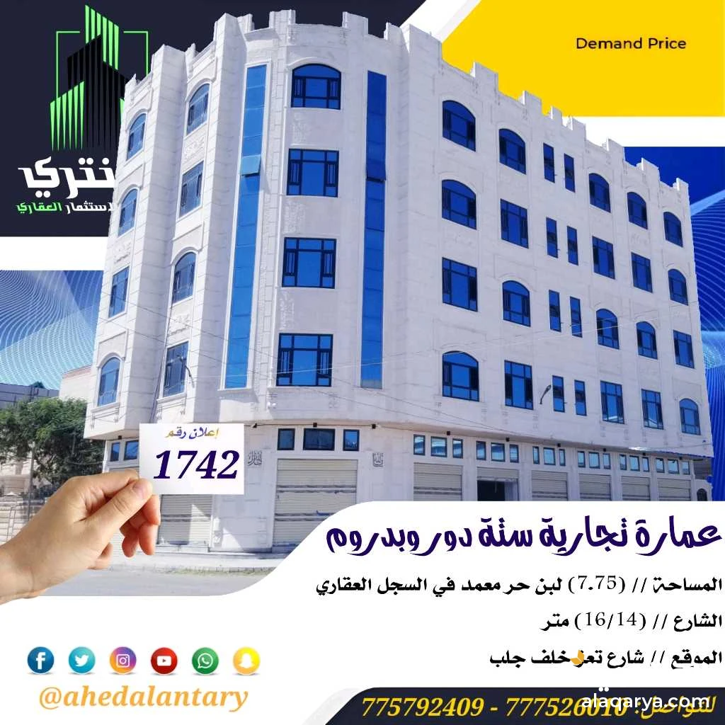 عرض رقم (1742) عمارة تجارية ستة دور وبدروم شارعين في قمة الروعة والجمال.. المساحة // (7.75) لبن حر معمد في السجل العقاري.. الشارع // (16/14) متر.. الموقع // شارع تعز خلف جلب.. التفاصيل: عمارة تجارية ستة دور وبدروم شارعين في قمة الروعة والجمال - البدروم مفتوح كامل مواقف سيارات.. - الدور الاول يتكون من سبع فتحات تجارية وخزان ارضي ومدخلين للسيارات للبدروم وشقة في الخلف تتكون من كل شقة تتكون من غرفة نوم وصالة وحمام للحارس.. - الدور الثاني يتكون من شقتين كل شقة تتكون من كل شقة تتكون من (جناح عائلي غرف نوم مع الحمام) و غرفتين وصالة جانبية واسعة وحمام ومطبخ بمدخل عائلي ومجلس وحمام وصالة بمدخل مستقل.. - الدور الثالث والدور الرابع والدور الخامس والدور السادس نفس تصميم الدور الثاني.. 💫 صممت الأساسات لتحمل عدد تسعة دور وملحق وطيرمانة.. 💫 الاوراق معمدة وموثقة في السجل العقاري.. 💫 عمل كامل درجة اولى.. 💫 الموقع ارقئ واجمل الاحياء الراقي والجميلة في امانة العاصمة.. 💫 بالإضافة إلى مصعد كهربائي كبير.. 💫 بالإضافة إلى خزان ارضي يتسع كبير جدا.. 💫 بالإضافة إلى تهوية من جميع الجهات.. 💫 بالإضافة إلى ألومنيوم قطاع خاص.. 💫 بالإضافة إلى مدخلين للسيارات للبدروم.. 💫 بالإضافة إلى واجهتين حجر.. 💫 توثيق كامل ( صور + فيديو ) لجميع مراحل العمل.. *وميزات اخرى ستتعرف عليها وستشاهدها عند زيارتك لها* """"""""""""""""""""""""""""""""""""""""" #العنتري_للمقاولات_والإستثمار_العقاري #للتواصــــــــــــــل (777526010)📞 (775792409)📞 لمتابعة جميع عروضنا عبر صفحتنا على منصة الفيس بوك: https://www.facebook.com/antri.ye/ وللتواصل عبر الواتس مباشرة يرجى الضغط على الرابط التالي... https://wa.me/967775792409 للحصول على كل جديد في عالم العقارات تابع قناة عقارات العنتري للمقاولات والاستثمار العقاري في واتساب: https://whatsapp.com/channel/0029Va8yDxWGZNCzotxGlr1U لمتابعة جميع عروضنا على قناتنا في التيليجرام: https://t.me/+3HX_fv_09wNhYmJk رابط قناتنا على: youtube https://youtube.com/@ahedalantary 🔴 تنويه لعملائنا الكرام ومتابعينا الأعزاء يوجد لدينا مخزون هائل من العروض العقارية للفل والعمائر التجارية والمزارع والأرضي الإستثمارية العملاقة. 🔴 ملاحظة: جميع عقاراتنا من الملاك رأسا. 🔴 ملاحظة: الأسعار تتغير نتيجة لتفاوت أسعار الصرف والوضع الاقتصادي للبلد. 🌐🌐🌐🌐🌐🌐🌐🌐🌐🌐🌐🌐🌐🌐🌐🌐🌐🌐🌐