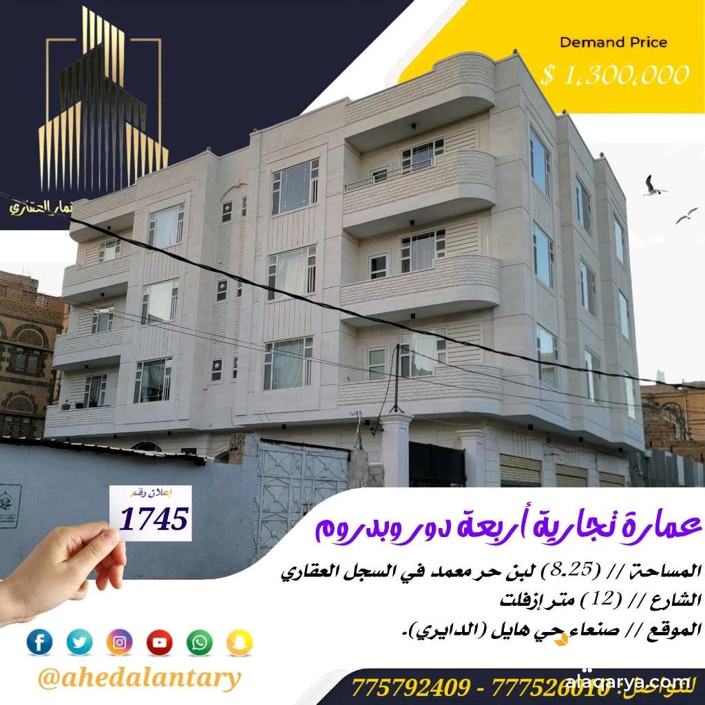 عرض رقم (1745) عمارة تجارية أربعة دور وبدروم سوبر لوكس.. المساحة // (8.25) لبن حر معمد في السجل العقاري.. الشارع // (12) متر إزفلت.. الموقع // صنعاء حي هايل (الدايري).. السعر // (1,300,000 $) مليون وثلاثمائة ألف دولار قابل للتفاوض.. التفاصيل: عمارة تجارية أربعة دور وبدروم سوبر لوكس.. - البدروم - الدور الاول يتكون من ثلاث فتحات تجارية وجراش سيارة وخزان ارضي وشقة في الخلف تتكون من من ثلاث غرف ومطبخ وحمام وصالة عائلية واسعه بمدخل عائلي ومجلس وحمام بمدخل مستقل.. - الدور الثاني يتكون من شقتين كل شقة تتكون من ثلاث غرف ومطبخ وبلكونة وحمام وصالة عائلية واسعه بمدخل عائلي ومجلس وحمام بمدخل مستقل.. - الدور الثالث والدور الرابع نفس تصميم الدور الثاني.. 💫 صممت الأساسات لتحمل عدد ستة دور وملحق وطيرمانة.. 💫 قريبة جدا من الشارع العام والاسوق.. 💫 قريب من شارع الدائري وقريب الجامعه القديمه.. 💫 الاوراق معمدة وموثقة في السجل العقاري.. 💫 عمل كامل درجة اولى.. 💫 الموقع ارقئ واجمل الاحياء الراقي والجميلة 💫 بالإضافة إلى خزان ارضي كبير جدا يتسع خمسة وايتات.. 💫 بالإضافة إلى جراش للسيارات.. 💫 بالاضافة إلى تهوية من جميع الجهات.. 💫 بالإضافة إلى واجهتين حجر علم رقم واحد.. 💫 توثيق كامل ( صور + فيديو ) لجميع مراحل العمل.. *وميزات اخرى ستتعرف عليها وستشاهدها عند زيارتك لها* """"""""""""""""""""""""""""""""""""""""" #العنتري_للمقاولات_والإستثمار_العقاري للتواصل: (777526010)📞 (775792409)📞 لمتابعة جميع عروضنا عبر صفحتنا على منصة الفيس بوك: https://www.facebook.com/antri.ye/ وللتواصل عبر الواتس مباشرة يرجى الضغط على الرابط التالي... https://wa.me/967775792409 للحصول على كل جديد في عالم العقارات تابعنا على قناة الواتساب.. https://whatsapp.com/channel/0029Va8yDxWGZNCzotxGlr1U رابط قناتنا على: youtube https://youtube.com/@ahedalantary 🔴 تنويه لعملائنا الكرام ومتابعينا الأعزاء يوجد لدينا مخزون هائل من العروض العقارية للفل والعمائر التجارية والمزارع والأرضي الإستثمارية العملاقة. 🔴 ملاحظة: جميع عقاراتنا من الملاك رأسا. 🔴 ملاحظة: الأسعار تتغير نتيجة لتفاوت أسعار الصرف والوضع الاقتصادي للبلد. 🌐🌐🌐🌐🌐🌐🌐🌐🌐🌐🌐🌐🌐🌐🌐🌐🌐🌐