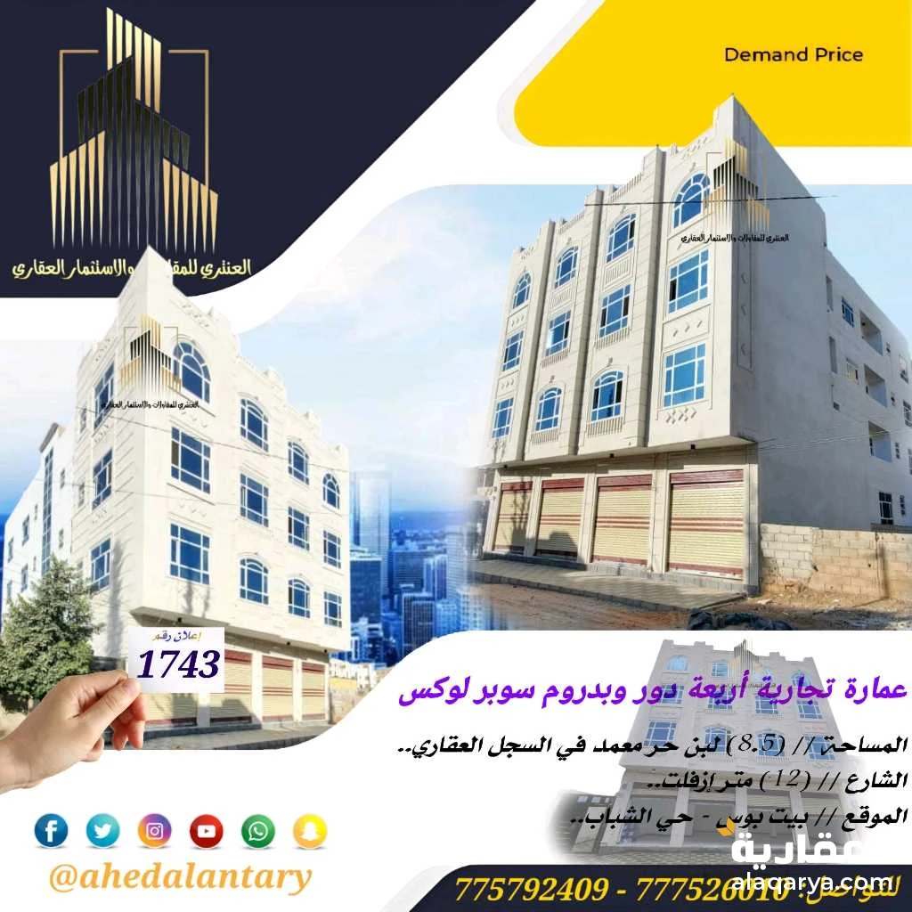 نقدم لكم الأفضل دائما.. ونحرص على اختيار التفاصيل بعناية.. لتستمر ثقتكم بنا دوماً.. نقدم لكم.. عرض رقم (1743) عمارة تجارية أربعة دور وبدروم سوبر لوكس... المساحة // (8.5) لبن حر معمد في السجل العقاري.. الشارع // (12) متر إزفلت.. الموقع // بيت بوس - حي الشباب.. السعر // (950,000 $) تسعمائة وخمسين الف دولار قابل للتفاوض.. التفاصيل: عمارة تجارية أربعة دور وبدروم سوبر لوكس... البدروم مفتوح نصف دور.. - الدور الاول يتكون من أربع فتحات تجارية وجراش ل خمس سيارات وخزان ارضي واسع وشقة في الخلف تتكون من (جناح عائلي غرف نوم مع الحمام) و غرفتين وصالة واسعه وحمام عائلي واسع ومطبخ واسع بمدخل عائلي ومجلس وحمام وصالة بمدخل مستقل - الدور الثاني يتكون من شقتين كل شقة تتكون من (جناح عائلي غرف نوم مع الحمام) وغرفتين نوم كبيرة ومطبخ واسع وحمام عائلي واسع وصالة واسعة وبلكونتين بمدخل عائلي ومجلس وحمام وصالة بمدخل مستقل.. - الدور الثالث والدور الرابع نفس تصميم الدور الثاني.. 💫 صممت الأساسات لتحمل عدد ستة دور وملحق وطيرمانة.. 💫 قريبة جدا من الشارع العام والاسوق.. 💫 الاوراق معمدة وموثقة في السجل العقاري.. 💫 عمل كامل درجة اولى.. 💫 الموقع ارقئ واجمل الاحياء الراقي والجميلة في امانة العاصمة.. 💫 بالإضافة إلى واجهة عدني.. 💫 بالإضافة إلى اساس ل مصعد كهربائي.. 💫 بالإضافة إلى خزان ارضي يتسع ل ستة وايتات.. 💫 بالإضافة إلى تهوية من جميع الجهات.. 💫 بالإضافة إلى حوش يتسع ل خمس سيارات.. 💫 بالإضافة إلى واجهة حجر.. 💫 توثيق كامل ( صور + فيديو ) لجميع مراحل العمل.. *وميزات اخرى ستتعرف عليها وستشاهدها عند زيارتك لها* """""""""""""""""""""""""""""""""""""""" ★ ـــــ👇🏻ـــــ🏢ــــ👇🏻ـــــ★ للتواصـل معنا الإتصال عبر الأرقـام التالية: 📱 775792409 📢 لـ نشر عروضكم الخاصة { بيت " عمارة " أرض " فلة " شقق ايجار " شقق تمليك " وجميع الخدمات العقارية } وعرضة للبيع أو للأيجار التواصل مع إدارة التسويق على الرقم 📱 775792409📱 ____________________★ لـمشاهـدة جميع عروضـنا الممـيزة والحصرية أنضم لصفحـتنا الخـاصة على فيسـبوك https://www.facebook.com/antri.ye ____________________★ وللتواصل عبر الواتس مباشرة يرجى الضغط على الرابط التالي... https://wa.me/967775792409 ____________________★ رابط قناتنا على: https://youtube.com/@ahedalantary ____________________★