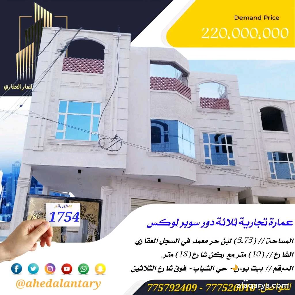عرض رقم (1754) عمارة تجارية ثلاثة دور سوبر لوكس.. المساحة // (5.75) لبن حر معمد في السجل العقاري.. الشارع // (10) متر مع ركن شارع (18) متر.. الموقع // بيت بوس - حي الشباب - فوق شارع الثلاثين.. السعر // (220,000,000) مائتين وعشرين مليون ريال قابل للتفاوض.. التفاصيل: عمارة تجارية ثلاثة دور سوبر لوكس.. - الدور الاول يتكون من فتحتين تجارية وجراش سيارة وخزان ارضي وشقة في الخلف تتكون من غرفتين وصالة استقبال وحمام ومطبخ بمدخل عائلي ومجلس وحمام بمدخل مستقل.. - الدور الثاني يتكون من شقتين كل شقة تتكون من غرفتين وصالة استقبال وحمام ومطبخ وبلكونة بمدخل عائلي ومجلس وحمام بمدخل مستقل.. - الدور الثالث باقي له السقف فقط.. 💫 صممت الأساسات لتحمل عدد خمسة دور وطيرمانة.. 💫 عمل كامل درجة اولى.. 💫 بالإضافة إلى تشطيب سوبر لوكس.. 💫 بالإضافة إلى حي راقي جدا.. 💫 جميع المواد المستخدمة درجة أولى.. 💫 بالإضافة إلى خزان ارضي يتسع ل خمسة وايتات.. 💫 بالإضافة إلى جراش سيارة.. 💫 بالإضافة إلى واجهة حجر.. 💫 توثيق كامل ( صور + فيديو ) لجميع مراحل العمل.. *وميزات اخرى ستتعرف عليها وستشاهدها عند زيارتك لها* """"""""""""""""""""""""""""""""""""""""" #العنتري_للمقاولات_والإستثمار_العقاري #للتواصــــــــــــــل (777526010)📞 (775792409)📞 لمتابعة جميع عروضنا عبر صفحتنا على منصة الفيس بوك: https://www.facebook.com/antri.ye/ وللتواصل عبر الواتس مباشرة يرجى الضغط على الرابط التالي... https://wa.me/967775792409 للحصول على كل جديد في عالم العقارات تابع قناة عقارات العنتري للمقاولات والاستثمار العقاري في واتساب: https://whatsapp.com/channel/0029Va8yDxWGZNCzotxGlr1U لمتابعة جميع عروضنا على قناتنا في التيليجرام: https://t.me/+3HX_fv_09wNhYmJk رابط قناتنا على: youtube https://youtube.com/@ahedalantary 🔴 تنويه لعملائنا الكرام ومتابعينا الأعزاء يوجد لدينا مخزون هائل من العروض العقارية للفل والعمائر التجارية والمزارع والأرضي الإستثمارية العملاقة. 🔴 ملاحظة: جميع عقاراتنا من الملاك رأسا. 🔴 ملاحظة: الأسعار تتغير نتيجة لتفاوت أسعار الصرف والوضع الاقتصادي للبلد. 🌐🌐🌐🌐🌐🌐🌐🌐🌐🌐🌐🌐🌐🌐🌐🌐🌐🌐🌐