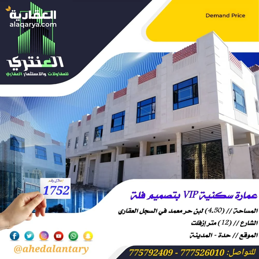 عرض رقم (1752) عمارة سكنية VIP بتصميم فلة سوبر لوكس.. المساحة // (4.50) لبن حر معمد في السجل العقاري.. الشارع // (12) متر إزفلت.. الموقع // حدة - المدينة.. السعر // (480,000 $) أربعمائة وثمانين ألف دولار قابل للتفاوض.. التفاصيل: عمارة سكنية VIP بتصميم فلة سوبر لوكس.. البدروم والدور الاول دوبلكس.. - البدروم يتكون من جناح عائلي غرف نوم مع الحمام وغرفة وحمام ومطبخ وصالة مفتوحة الدورالأول يتكون من مجلس وحمام وصالة وغرفة وحمام.. - الدور الثاني يتكون من (جناح عائلي غرف نوم مع الحمام) وغرفتين وصالة وحمام ومطبخ وبلكونة ومخزن بمدخل عائلي ومجلس وحمام بمدخل مستقل.. 💫 صممت الأساسات لتحمل عدد ستة دور وملحق وطيرمانة.. 💫 قريبة جدا من الشارع العام.. 💫 بالإضافة إلى تشطيب VIP.. 💫 عمل كامل درجة اولى.. 💫 بالإضافة إلى حي راقي جدآ.. 💫 بالإضافة إلى قريبة جميع الخدمات العامة والمواصلات.. 💫 بالإضافة إلى خزان ارضي يتسع ل خمسة وايتات.. 💫 بالإضافة إلى تهوية من جميع الجهات.. 💫 بالإضافة إلى مواقف للسيارات.. 💫 بالإضافة إلى واجهتين حجر.. 💫 بالإضافة إلى واجهة غربي.. 💫 تشطيب ديلوكس ومن أفخر انواع التشطيبات.. 💫 التصميم فيهن من التصاميم الحديثة.. 💫 توثيق كامل ( صور + فيديو ) لجميع مراحل العمل.. *وميزات اخرى ستتعرف عليها وستشاهدها عند زيارتك لها* """"""""""""""""""""""""""""""""""""""""" #العنتري_للمقاولات_والإستثمار_العقاري للتواصل: (777526010)📞 (775792409)📞 لمتابعة جميع عروضنا عبر صفحتنا على منصة الفيس بوك: https://www.facebook.com/antri.ye/ وللتواصل عبر الواتس مباشرة يرجى الضغط على الرابط التالي... https://wa.me/967775792409 للحصول على كل جديد في عالم العقارات تابعنا على قناة الواتساب.. https://whatsapp.com/channel/0029Va8yDxWGZNCzotxGlr1U رابط قناتنا على: youtube https://youtube.com/@ahedalantary 🔴 تنويه لعملائنا الكرام ومتابعينا الأعزاء يوجد لدينا مخزون هائل من العروض العقارية للفل والعمائر التجارية والمزارع والأرضي الإستثمارية العملاقة. 🔴 ملاحظة: جميع عقاراتنا من الملاك رأسا. 🔴 ملاحظة: الأسعار تتغير نتيجة لتفاوت أسعار الصرف والوضع الاقتصادي للبلد. 🌐🌐🌐🌐🌐🌐🌐🌐🌐🌐🌐🌐🌐🌐🌐🌐🌐🌐🌐