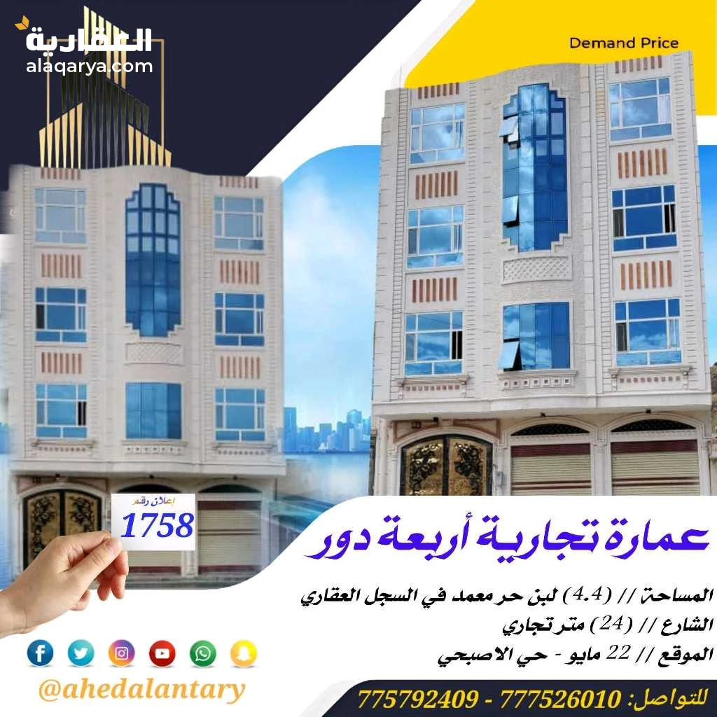 شعارنا ..ثقة - ربح - أمان .. وكما وعدناكم بمفاجآت عديدة خلال وتلبية لاحتياجاتكم ورغباتكم، نقدم لكم: عرض رقم (1758) عمارة تجارية أربعة دور سوبر لوكس.. المساحة // (4.4) لبن حر معمد في السجل العقاري.. الشارع // (24) متر تجاري.. الموقع // 22 مايو - حي الاصبحي.. السعر // (300,000,000) ثلاثمائة مليون ريال.. التفاصيل: - الدور الاول يتكون من فتحتين تجارية وجراش سيارتين وخزان ارضي كبير وشقة في الخلف وحوش دوران - الدور الثاني يتكون من شقتين كل شقة تتكون من غرفتين وصالة وحمام ومطبخ بمدخل عائلي ومجلس وحمام بمدخل مستقل.. - الدور الثالث نفس تصميم الدور الثاني.. - الدور الرابع باقي له السقف.. 💫 صممت الأساسات لتحمل عدد ستة دور وملحق وطيرمانة.. 💫 بالإضافة إلى تشطيبات سوبر لوكس.. 💫 عمل كامل درجة اولى.. 💫 بالإضافة إلى موقع ذهبي.. 💫 بالإضافة إلى قريبة من جميع الخدمات.. 💫 بالإضافة إلى مجاري ومشروع ماء حكومي وكهربا حكومي.. 💫 جميع المواد المستخدمة درجة أولى.. 💫 بالإضافة إلى خزان ارضي يتسع ل ستة وايتات.. 💫 بالإضافة إلى جراش سيارتين.. 💫 بالإضافة إلى حوش دوران.. 💫 بالإضافة إلى واجهة حجر.. 💫 بالإضافة إلى توثيق كامل ( صور + فيديو ) لجميع مراحل العمل.. *وميزات اخرى ستتعرف عليها وستشاهدها عند زيارتك لها* """"""""""""""""""""""""""""""""""""""""" #العنتري_للمقاولات_والإستثمار_العقاري للتواصل: (777526010)📞 (775792409)📞 لمتابعة جميع عروضنا عبر صفحتنا على منصة الفيس بوك: https://www.facebook.com/antri.ye/ وللتواصل عبر الواتس مباشرة يرجى الضغط على الرابط التالي... https://wa.me/967775792409 للحصول على كل جديد في عالم العقارات تابعنا على قناة الواتساب.. https://whatsapp.com/channel/0029Va8yDxWGZNCzotxGlr1U رابط قناتنا على: youtube https://youtube.com/@ahedalantary 🔴 تنويه لعملائنا الكرام ومتابعينا الأعزاء يوجد لدينا مخزون هائل من العروض العقارية للفل والعمائر التجارية والمزارع والأرضي الإستثمارية العملاقة. 🔴 ملاحظة: جميع عقاراتنا من الملاك رأسا. 🔴 ملاحظة: الأسعار تتغير نتيجة لتفاوت أسعار الصرف والوضع الاقتصادي للبلد. 🌐🌐🌐🌐🌐🌐🌐🌐🌐🌐🌐🌐🌐🌐🌐🌐🌐🌐🌐