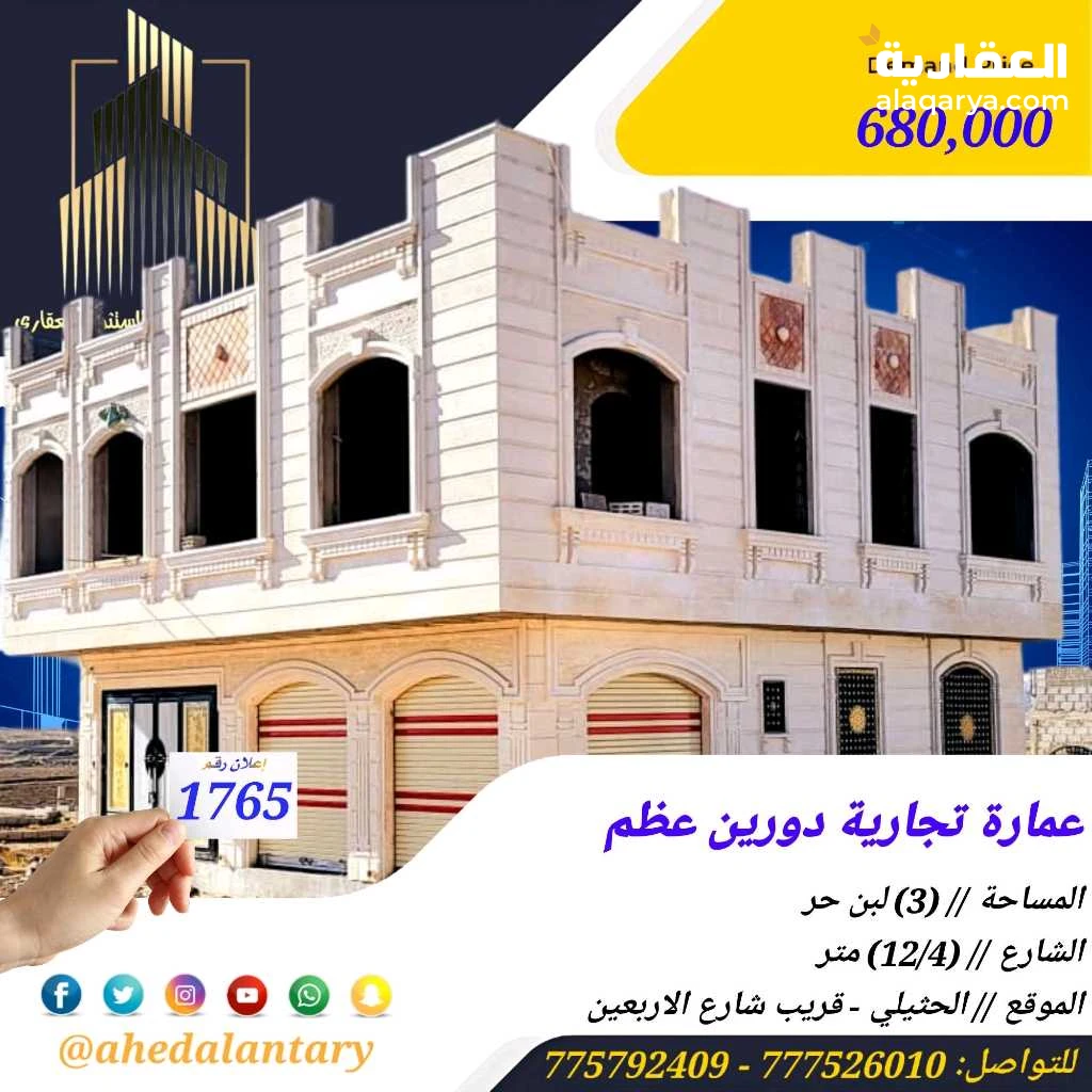 عمارة تجارية دورين عظم في قمة الروعة والجمال عرض رقم (1765) المساحة // (3) لبن حر.. الشارع // (12/4) متر.. الموقع // الحثيلي - قريب شارع الاربعين.. السعر // (680,000) ستمائة وثمانين ألف ريال سعودي قابل للتفاوض.. التفاصيل: - الدورالاول يتكون من ثلاث فتحات تجارية وحمام وجراش سياره وخزان ارضي وشقة في الخلف تتكون من غرفتين وصالة ومطبخ وحمام بمدخل عائلي ومجلس وحمام مستقل.. - الدور الثاني يتكون من شقتين كل شقة تتكون من غرفتين وحمام ومطبخ ومجلس وحمام.. 💫 صممت الأساسات لتحمل عدد خمسة دور وملحق.. 💫 بالإضافة إلى عمل كامل درجة اولى.. 💫 بالإضافة إلى خزان ارضي يتسع ل أربعة وايتات.. 💫 بالإضافة إلى جراش سيارة.. 💫 بالإضافة إلى واجهتين حجر.. 💫 العمل مسلح درجة أولى.. 💫 توثيق كامل ( صور + فيديو ) لجميع مراحل العمل.. *وميزات اخرى ستتعرف عليها وستشاهدها عند زيارتك لها* """"""""""""""""""""""""""""""""""""""""" #العنتري_للمقاولات_والإستثمار_العقاري للتواصل: (777526010)📞 (775792409)📞 لمتابعة جميع عروضنا عبر صفحتنا على منصة الفيس بوك: https://www.facebook.com/antri.ye/ وللتواصل عبر الواتس مباشرة يرجى الضغط على الرابط التالي... https://wa.me/967775792409 للحصول على كل جديد في عالم العقارات تابعنا على قناة الواتساب.. https://whatsapp.com/channel/0029Va8yDxWGZNCzotxGlr1U رابط قناتنا على: youtube https://youtube.com/@ahedalantary 🔴 تنويه لعملائنا الكرام ومتابعينا الأعزاء يوجد لدينا مخزون هائل من العروض العقارية للفل والعمائر التجارية والمزارع والأرضي الإستثمارية العملاقة. 🔴 ملاحظة: جميع عقاراتنا من الملاك رأسا. 🔴 ملاحظة: الأسعار تتغير نتيجة لتفاوت أسعار الصرف والوضع الاقتصادي للبلد. 🌐🌐🌐🌐🌐🌐🌐🌐🌐🌐🌐🌐🌐🌐🌐🌐🌐🌐🌐
