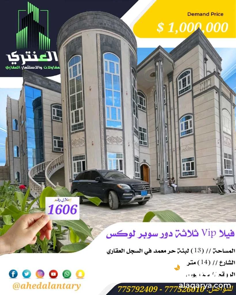 اعلان رقم (1606) فيلا Vip ثلاثة دور سوبر لوكس.. المساحة // (13) لبنة حر معمد في السجل العقاري.. الشارع // (14) متر.. الموقع // بيت بوس.. التفاصيل: فيلا Vip ثلاثة دور سوبر لوكس.. - الدور الاول يتكون من مسبح وصالة رياضية وصالة مفتوحة كبيره وحمام ومطبخ وغرفة.. - الدور الثاني يتكون من جناح الاستقبال مجلس مع صالة كبيره وحمام ودرج خارجية حلزونية بمدخل مستقل للرجال.. واثنين اجنحة عائلي كل جناح يحتوي على غرفة نوم مع الحمام وغرفتين ومطبخ وصالة واسعه.. - الدور الثالث يتكون من أربعه اجنحة نوم كل جناح يحتوي على غرفة نوم مع الحمام والصالات وغرفة ومطبخ وبلكونة كبيره.. ⭐مميزاتها⭐ 💢 الصور تتكلم عن نفسها... 💫 بالإضافة تشطيب سوبر لوكس.. 💫 بالإضافة إلى حواش واسع جدا.. 💫 بالإضافة إلى موقع مطل.. 💫 كما انها تتميز بتصميم حديث.. 💫 ومتنفسات وممرات راقيه من جميع الاتجاهات معها منافس من جميع الاتجاهات.. 💫 الشبابيك قطاع خاص دبل.. 💫 أبواب استيل حديد نحت ليزر.. 💫 بلاط إسباني من الدرجه الاولى.. 💫 تشطيبات ديلوكس في قمة الرووعة.. 💫 الاضائة تحكم بريموت.. 💫 الحي أرقى حي باالكامل فلل.. 💫 بالإضافة إلى حجر دوران.. 💫 بالإضافة إلى موقع ذهبي.. 💫 وجميع الاعمال موثقه من بداية الأعمال الإنشائية حتى آخر اللمسات.. 💫 مصممه بأحدث المواصفات وعلى أيدي مهندسين معماريين وخبراء لديهم خبرة العمل التي تفي بغرض بناء وتشييد تذكار تاريخي لهم.. *وميزات اخرى ستتعرف عليها وستشاهدها عند زيارتك لها* """"""""""""""""""""""""""""""""""""""""" #العنتري_للمقاولات_والإستثمار_العقاري للتواصل: (777526010)📞 (775792409)📞 لمتابعة جميع عروضنا عبر صفحتنا على منصة الفيس بوك: https://www.facebook.com/antri.ye/ وللتواصل عبر الواتس مباشرة يرجى الضغط على الرابط التالي... https://wa.me/967775792409 للحصول على كل جديد في عالم العقارات تابع قناة عقارات العنتري للمقاولات والاستثمار العقاري في واتساب: https://whatsapp.com/channel/0029Va8yDxWGZNCzotxGlr1U لمتابعة جميع عروضنا على قناتنا في التيليجرام: https://t.me/+3HX_fv_09wNhYmJk رابط قناتنا على: youtube https://youtube.com/@ahedalantary 🔴 تنويه لعملائنا الكرام ومتابعينا الأعزاء يوجد لدينا مخزون هائل من العروض العقارية للفل والعمائر التجارية والمزارع والأرضي الإستثمارية العملاقة. 🔴 ملاحظة: جميع عقاراتنا من الملاك رأسا. 🔴 ملاحظة: الأسعار تتغير نتيجة لتفاوت أسعار الصرف والوضع الاقتصادي للبلد. 🌐🌐🌐🌐🌐🌐🌐🌐🌐🌐🌐🌐🌐🌐🌐🌐🌐🌐🌐
