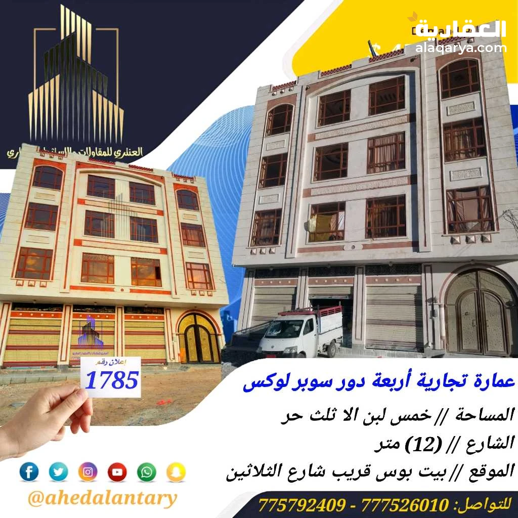 عرض رقم (1785) عمارة تجارية أربعة دور سوبر لوكس.. المساحة // خمس لبن الا ثلث حر.. الشارع // (12) متر.. الموقع // بيت بوس قريب شارع الثلاثين. السعر // (420,000 $) اربعمائة وعشرين الف دولار.. التفاصيل عمارة تجارية أربعة دور تتكون من سبع شقق وثلاث فتحات تجارية - الدور الاول ثلاث فتحات تجارية وجراش سيارة وخزان ارضي وشقة في الخلف تتكون من غرفة وحمام ومطبخ وصالة.. - الدور الثاني يتكون من شقتين كل شقة تتكون من ثلاث غرف وحمامين ومطبخ وصالة طعام وبلكونة.. - الدور الثالث والدور الرابع نفس تصميم الدور الثاني.. 💫 صممت الأساسات لتحمل عدد خمسة دور وملحق وطيرمانة.. 💫 بالإضافة إلى تشطيبات سوبر لوكس.. 💫 عمل كامل درجة اولى.. 💫 بالإضافة إلى واجهة غربي.. 💫 بالإضافة إلى تهوية دوران.. 💫 جميع المواد المستخدمة درجة أولى.. 💫 بالإضافة إلى خزان ارضي يتسع ل خمسة وايتات.. 💫 بالإضافة إلى حوش سيارة.. 💫 بالإضافة إلى واجهة حجر.. 💫 بالإضافة إلى توثيق كامل ( صور + فيديو ) لجميع مراحل العمل.. *وميزات اخرى ستتعرف عليها وستشاهدها عند زيارتك لها* """"""""""""""""""""""""""""""""""""""""" #العنتري_للمقاولات_والإستثمار_العقاري للتواصل: (777526010)📞 (775792409)📞 لمتابعة جميع عروضنا عبر صفحتنا على منصة الفيس بوك: https://www.facebook.com/antri.ye/ وللتواصل عبر الواتس مباشرة يرجى الضغط على الرابط التالي... https://wa.me/967775792409 رابط قناتنا على: youtube https://youtube.com/@ahedalantary 🔴 تنويه لعملائنا الكرام ومتابعينا الأعزاء يوجد لدينا مخزون هائل من العروض العقارية للفل والعمائر التجارية والمزارع والأرضي الإستثمارية العملاقة. 🔴 ملاحظة: جميع عقاراتنا من الملاك رأسا. 🔴 ملاحظة: الأسعار تتغير نتيجة لتفاوت أسعار الصرف والوضع الاقتصادي للبلد. 🌐🌐🌐🌐🌐🌐🌐🌐🌐🌐🌐🌐🌐🌐🌐🌐🌐🌐🌐