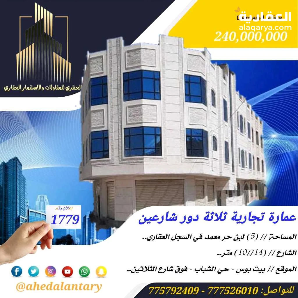عرض رقم (1779) عمارة تجارية ثلاثة دور شارعين سوبر لوكس.. المساحة // (5) لبن حر معمد في السجل العقاري.. الشارع // (14//10) متر.. الموقع // بيت بوس - حي الشباب - فوق شارع الثلاثين.. السعر // (240,000,000) مائتين وأربعين مليون ريال قابل للتفاوض.. التفاصيل: العمارة تتكون من ثلاثة دور كل دور يتكون من شقتين كبار نضام فلة مشطبة سوبر لوكس عمل شخصي نضيف خمس فتحات وحوش سيارات.. *وميزات اخرى ستتعرف عليها وستشاهدها عند زيارتك لها* """"""""""""""""""""""""""""""""""""""""" #العنتري_للمقاولات_والإستثمار_العقاري للتواصل: (777526010)📞 (775792409)📞 لمتابعة جميع عروضنا عبر صفحتنا على منصة الفيس بوك: https://www.facebook.com/antri.ye/ وللتواصل عبر الواتس مباشرة يرجى الضغط على الرابط التالي... https://wa.me/967775792409 للحصول على كل جديد في عالم العقارات تابعنا على قناة الواتساب.. https://whatsapp.com/channel/0029Va8yDxWGZNCzotxGlr1U رابط قناتنا على: youtube https://youtube.com/@ahedalantary 🔴 تنويه لعملائنا الكرام ومتابعينا الأعزاء يوجد لدينا مخزون هائل من العروض العقارية للفل والعمائر التجارية والمزارع والأرضي الإستثمارية العملاقة. 🔴 ملاحظة: جميع عقاراتنا من الملاك رأسا. 🔴 ملاحظة: الأسعار تتغير نتيجة لتفاوت أسعار الصرف والوضع الاقتصادي للبلد. 🌐🌐🌐🌐🌐🌐🌐🌐🌐🌐🌐🌐🌐🌐🌐🌐🌐🌐🌐