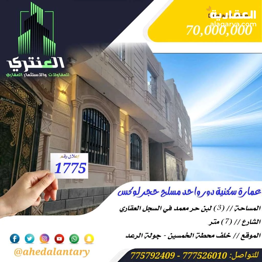 عرض رقم (1775) عمارة سكنية دور واحد مسلح حجر سوبر لوكس.. المساحة // (3) لبن حر معمد في السجل العقاري.. الشارع // (7) متر.. الموقع // خلف محطة الخمسين - جولة الرعد.. السعر // (70,000,000) سبعين مليون ريال قابل للتفاوض.. التفاصيل: بيت دور واحد مسلح حجر تسليم مفتاح.. يتكون من (جناح عائلي غرف نوم مع الحمام) وغرفة وحمام ومطبخ وصالة معيشة بمدخل عائلي ومجلس وحمام بمدخل مستقل وجراش سيارة.. 💫 بالإضافة إلى ساس ل أربعة دور.. 💫 بالإضافة إلى تشطيب ديلوكس.. 💫 بالإضافة إلى خزان أرضي.. 💫 بالإضافة إلى واجهة حجر.. 💫 كما انها قريبة جدآ من شارع 24 تبعد حدود خمسين متر فقط.. *وميزات اخرى ستتعرف عليها وستشاهدها عند زيارتك لها* """"""""""""""""""""""""""""""""""""""""" #العنتري_للمقاولات_والإستثمار_العقاري للتواصل: (777526010)📞 (775792409)📞 لمتابعة جميع عروضنا عبر صفحتنا على منصة الفيس بوك: https://www.facebook.com/antri.ye/ وللتواصل عبر الواتس مباشرة يرجى الضغط على الرابط التالي... https://wa.me/967775792409 للحصول على كل جديد في عالم العقارات تابع قناة عقارات العنتري للمقاولات والاستثمار العقاري في واتساب: https://whatsapp.com/channel/0029Va8yDxWGZNCzotxGlr1U لمتابعة جميع عروضنا على قناتنا في التيليجرام: https://t.me/+3HX_fv_09wNhYmJk رابط قناتنا على: youtube https://youtube.com/@ahedalantary 🔴 تنويه لعملائنا الكرام ومتابعينا الأعزاء يوجد لدينا مخزون هائل من العروض العقارية للفل والعمائر التجارية والمزارع والأرضي الإستثمارية العملاقة. 🔴 ملاحظة: جميع عقاراتنا من الملاك رأسا. 🔴 ملاحظة: الأسعار تتغير نتيجة لتفاوت أسعار الصرف والوضع الاقتصادي للبلد. 🌐🌐🌐🌐🌐🌐🌐🌐🌐🌐🌐🌐🌐🌐🌐🌐🌐🌐🌐