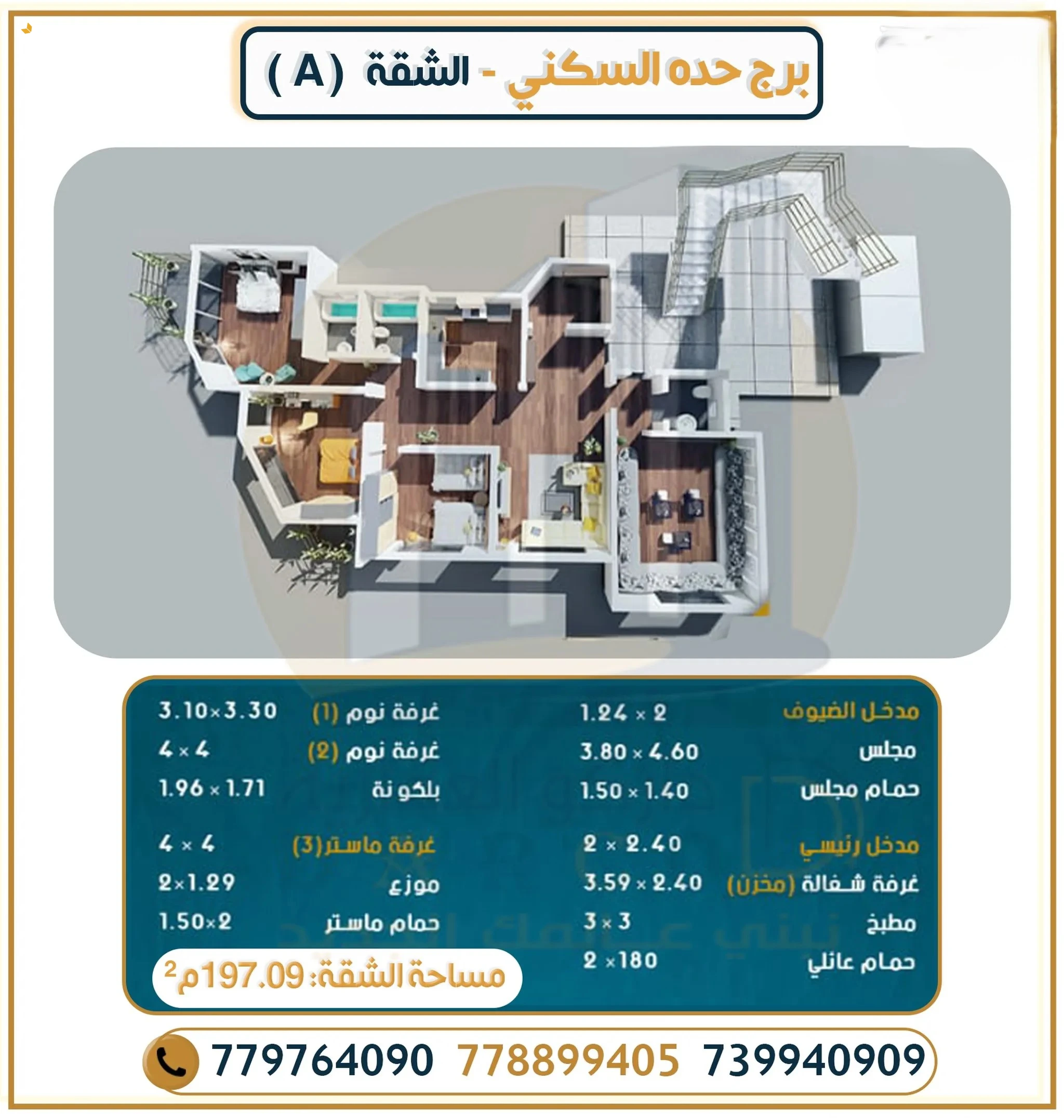 *الموقع*: *#صنعاء #حـــده على الشارع الزفلت قريب جداً من جولة #جسر_حده المدينة :* *نموذج ومساحة #الشقه:* نموذج الشقة *A* المساحة: 197.9م2 *السعــر:* 119 الف $ *مميزات المبنى #والشقق:* -تم تنفيذ البرج وفق *احدث المواصفات العالمية للتصميم والانشاء والبناء والتشطيب* -مواقع الابراج *مواقع استراتيجيه مفضله للمعيشه والإستثمار بفضل تواجد جميع الخدمات* - فرصة إستثماريه وسكنية للتملك بأسعار منافسه. - ضمان جودة للعمل الإنشائي. - شهادة ضمان للأعمال الكهربائية. - شهادة ضمان لأعمال السباكة. - ضمان وصيانة المصاعد لمدة 5 أعوام. - إستخدام مواد عالية الجوده. - إحتواء البرج على عدد قليل من الشقق سكنية فاخره وهذا يوفر للعملاء الخصوصيه التامة. - توفير مصاعد كهربائية لتسهيل عدم الإنتظار بأوقات الذروة بواقع مصعد - تصاميم معمارية عصرية ذات جودة عالية. - إتجاهات الشقق شرقيه وغربيه وجنوبي لتنعم بأجواء دافئة طوال العام. - نظام توفير الطاقه خاص بكل شقة. - يتمتع هذا الحي بتوفير كافة الخدمات( كهرباء ،مياة، صرف صحي، هاتف ثابت) - 2 خزانات مياة( علوي+سفلي) . - تأسيس أنظمة الطاقة البديلة. - تأسيس شبكة المياة الحارة بإستخدام السخان الشمسي. - مواقف سيارات خاصة وعامة. - أنظمة أمن وسلامة ومراقبة للمواقف ومرافق البرج. - أنظمة حراسه ونظافه مستمره على مدار الساعة للمزيد من المعلومات والاستفسارات اتصال او واتساب يرجى التواصل على الارقام: 779764090 739940909 رابط الواتساب : https://wa.me/message/X2MC75EWEWRNG1