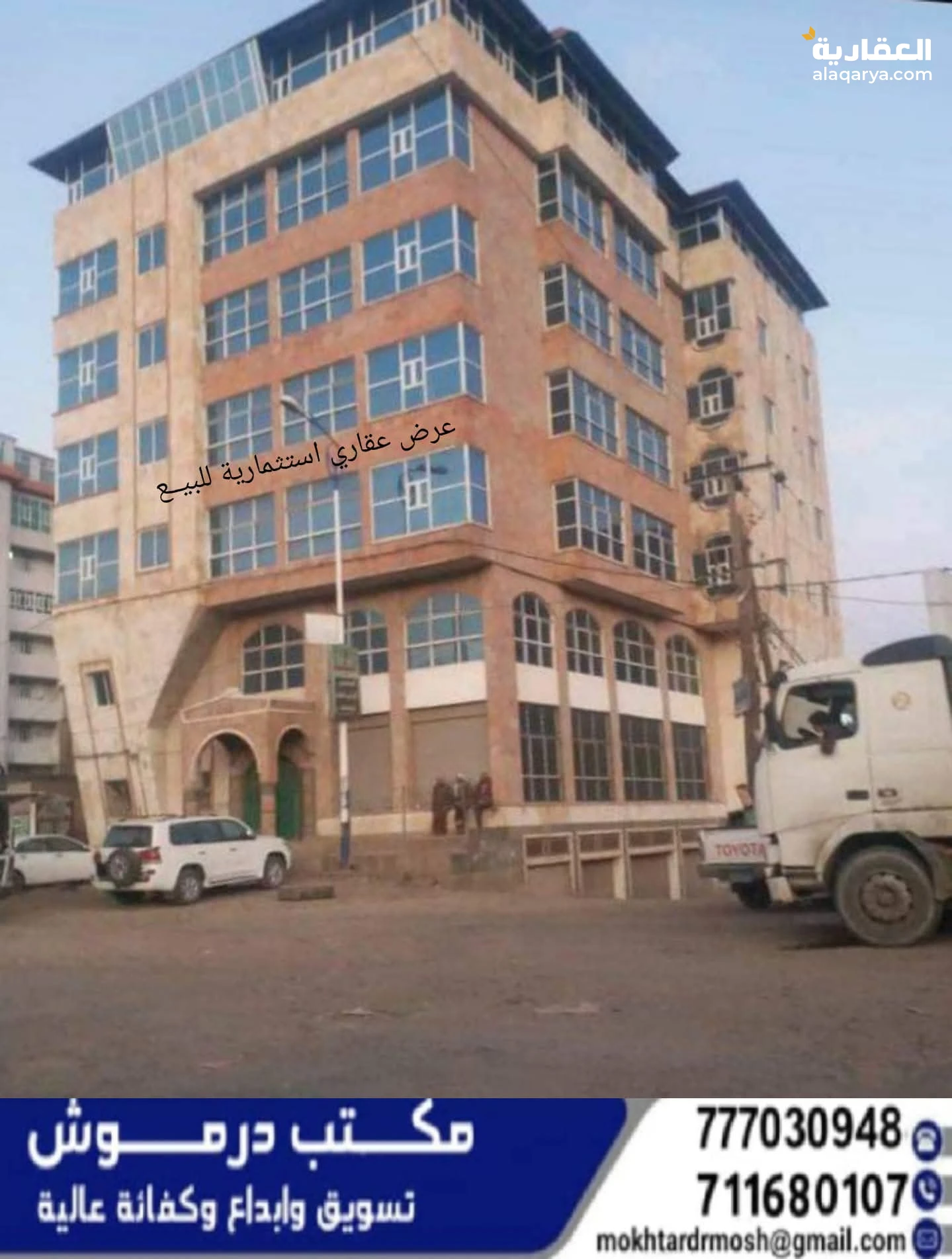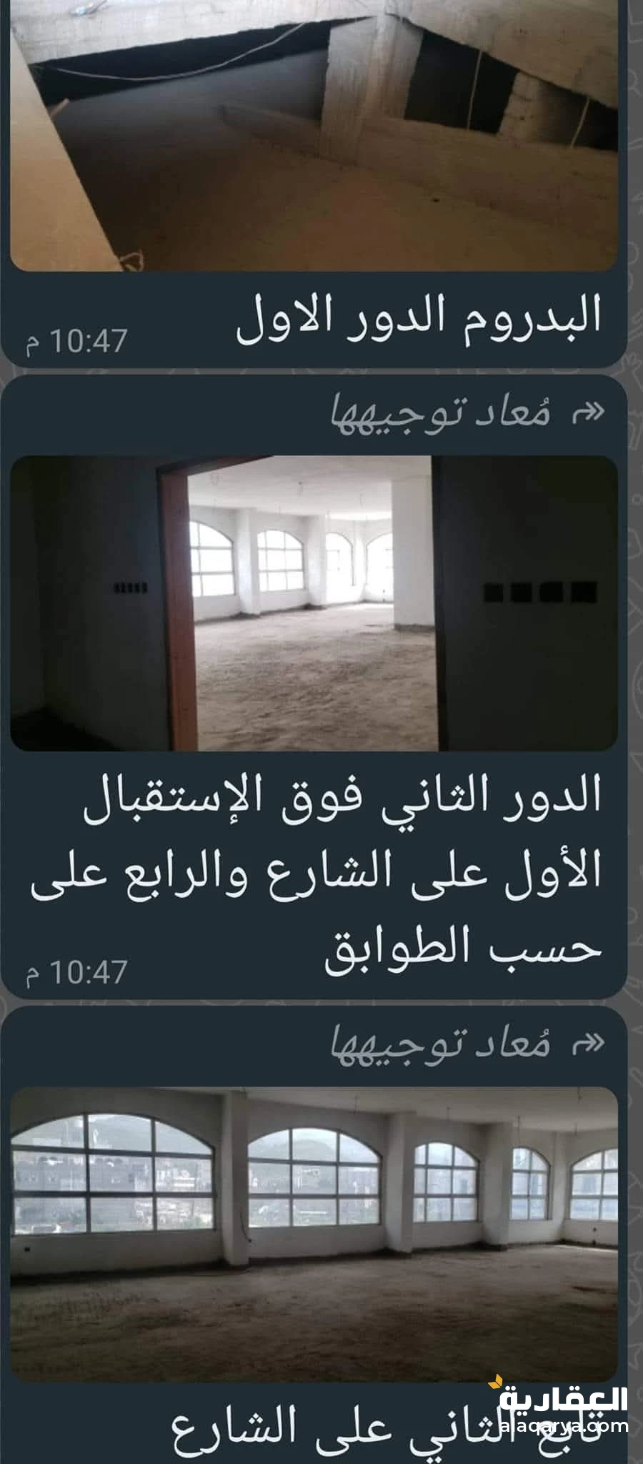 أفضل العروض العقارية مكتب عقاري متميز يقدم لكم باقة حصرية من أفضل ألعروض العروض العقارية للبيع في #مدينة #إب عقارات محافظة إب مكتب درموش عمارة تجارية استثمارية ركنية شارعين شارع تعز شارع جانبي مصمم المبنى تجاري استثماري 1_المساحة18قصبة #المساحة_القصبةبالمتر المربع=56 متر *-اجمالى المساحة الأرض = 1,012.5مترمربع مع الحوش *_المسطح المبنى550 متر مربع *_بقية المساحة حوش للسيارات خلف المبنى *_ خزان خزان أرضي *_المبنى شبه جاهز مشطب أكثر من80% *_الشبابيك الالمنيوم الخارجي مع الأبواب الرئيسية جاهزة ا*_المبنى شبه جاهز باقي له بعض التجهيزات 2-يتكون المبنى من 2 بدروم مصمم مواقف لسيارات 3-الدور الأول الذي هو مدخل المبنى عبارة عن دور إستقبال 4-الدور الثاني صالة أفراح مع ملحقاته 5- الأربعة الأدوار العلوية يتكون من 16 جناح والجناح يتكون من غرفتين مع صالة مع حمام وبلكونه 6_يوجد فيه ٣٠ غرفة مع حمام وصالة لكل غرفة 7-الدور السابع عبارة عن إستراحة عامه مفتوحة 8-المبنى مصمم لاكثر من 15دور👇🏻 مميزات اخرى ستتعرف عليها وستشاهدها عند زيارتك لها مخططات غير ذالك 📞 **للاستفسار أو للمزيد من العروض العقارية، يمكنك التواصل معنا عبر الأرقام:** - 777030948 - 711680107 🔗 **تابعونا على:** - يوتيوب: [قناتنا على يوتيوب] (https://youtube.com/user/mokhtar9991) - فيسبوك: [صفحتنا على فيسبوك] (https://www.facebook.com/mokhtardrmosh ) لا تفوتوا هذه الفرصة، فنحن هنا لتلبية جميع احتياجاتكم العقارية بأفضل المواقع والأسعار!📲