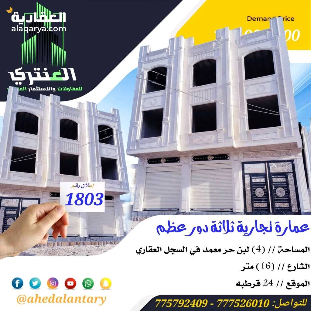 عرض رقم (1803) عمارة تجاريه ثلاثه دور والرابع ستره عظم مسلح هردي واجهه حجر بناء حديث جدا و متميز.. المساحة // (4) لبن حر معمد في السجل العقاري.. الشارع // (16) متر.. الموقع // 24 قرطبه تبعد عن شارع خولان ب 100 متر بجانب مسبح الدلفين.. السعر // (140,000,000) مائة وأربعين مليون ريال قابل للتفاوض.. #للتواصــــــــــــــل (777526010)📞 (775792409)📞