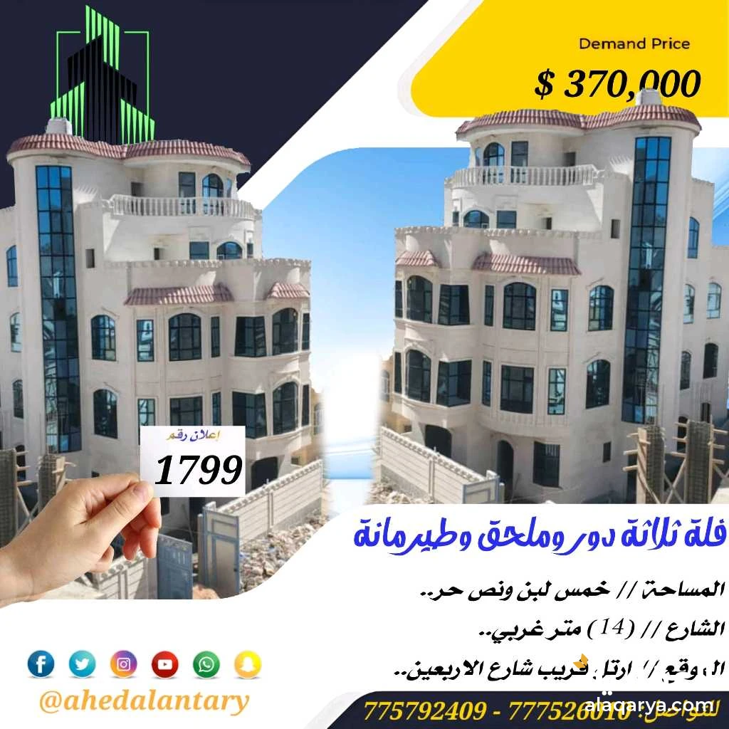 عرض رقم (1799) فلة ثلاثة دور وملحق وطيرمانة سوبر لوكس كل دور مستقل بنظام فله.. المساحة // خمس لبن ونص حر.. الشارع // (14) متر غربي.. الموقع // ارتل قريب شارع الاربعين.. السعر // (370,000 $) ثلاثمائة وسبعين الف دولار قابل للتفاوض.. #للتواصــــــــــــــل (777526010)📞 (775792409)📞