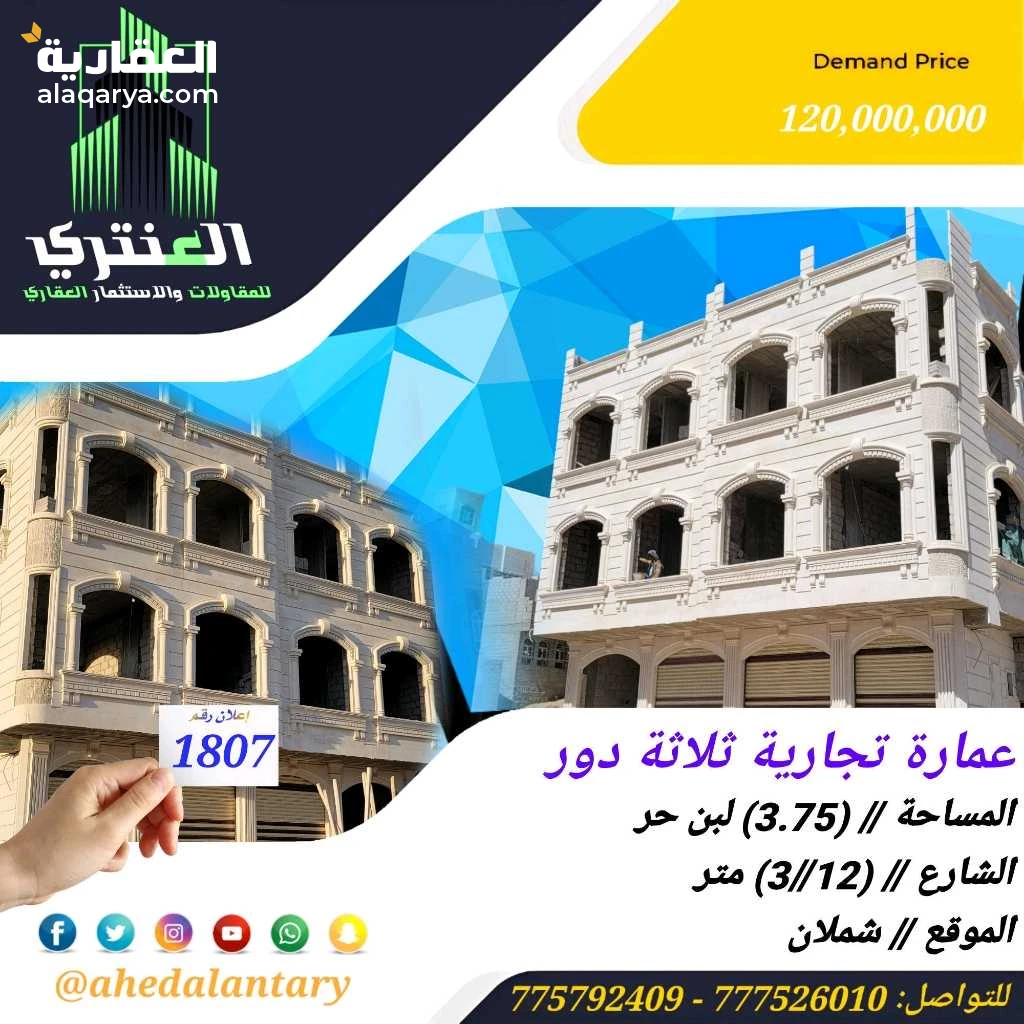 عرض رقم (1807) عمارة تجارية ثلاثة دور عظم.. المساحة // (3.75) لبن حر.. الشارع // (12//3) متر.. الموقع // شملان.. السعر // (120,000,000) مائة عشرين مليون ريال قابل للتفاوض.. التفاصيل: عمارة تجارية ثلاثة دور عظم.. - الدور الاول يتكون من ثلاث فتحات تجارية وجراش سيارة وخزان ارضي وشقة في الخلف تتكون من غرفتين وصالة وحمام ومطبخ بمدخل عائلي ومجلس وحمام بمدخل مستقل.. - الدور الثاني يتكون من شقتين كل شقة تتكون من غرفتين وصالة معيشة وحمام ومطبخ بمدخل عائلي ومجلس وحمام بمدخل مستقل.. 💫 صممت الأساسات لتحمل عدد خمسة دور وملحق.. 💫 الاوراق معمدة وموثقة في السجل العقاري.. 💫 بالإضافة إلى عمل كامل درجة اولى.. 💫 بالإضافة إلى خزان ارضي يتسع ل أربعة وايتات.. 💫 بالإضافة إلى جراش سيارة.. 💫 بالإضافة إلى واجهتين حجر.. 💫 بالإضافة إلى واجهة جنوبي (عدني) غربي.. 💫 العمل مسلح درجة أولى.. 💫 توثيق كامل ( صور + فيديو ) لجميع مراحل العمل.. *وميزات اخرى ستتعرف عليها وستشاهدها عند زيارتك لها* """"""""""""""""""""""""""""""""""""""""" #العنتري_للمقاولات_والإستثمار_العقاري للتواصل: (777526010)📞 (775792409)📞 لمتابعة جميع عروضنا عبر صفحتنا على منصة الفيس بوك: https://www.facebook.com/antri.ye/ وللتواصل عبر الواتس مباشرة يرجى الضغط على الرابط التالي... https://wa.me/967775792409 للحصول على كل جديد في عالم العقارات تابعنا على قناة الواتساب.. https://whatsapp.com/channel/0029Va8yDxWGZNCzotxGlr1U رابط قناتنا على: youtube https://youtube.com/@ahedalantary 🔴 تنويه لعملائنا الكرام ومتابعينا الأعزاء يوجد لدينا مخزون هائل من العروض العقارية للفل والعمائر التجارية والمزارع والأرضي الإستثمارية العملاقة. 🔴 ملاحظة: جميع عقاراتنا من الملاك رأسا. 🔴 ملاحظة: الأسعار تتغير نتيجة لتفاوت أسعار الصرف والوضع الاقتصادي للبلد. 🌐🌐🌐🌐🌐🌐🌐🌐🌐🌐🌐🌐🌐🌐🌐🌐🌐🌐🌐