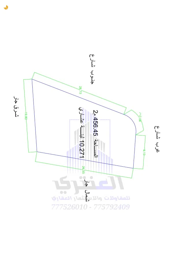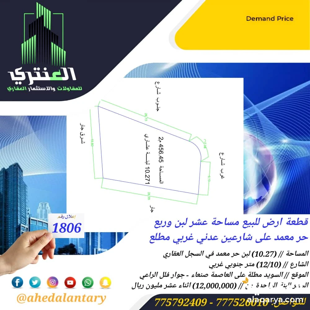 عرض رقم (1806) *قطعة ارض للبيع مساحة عشر لبن وربع حر معمد على شارعين جنوبي غربي مطلة على العاصمة صنعاء...* المساحة // (10.27) لبن حر معمد في السجل العقاري.. الشارع // (12/10) متر جنوبي غربي.. الموقع // السويد مطلة على العاصمة صنعاء - جوار فلل الراعي.. السعر للبنة الواحدة من // (12,000,000) اثناء عشر مليون ريال.. *وميزات اخرى ستتعرف عليها وستشاهدها عند زيارتك لها* """"""""""""""""""""""""""""""""""""""""" #العنتري_للمقاولات_والإستثمار_العقاري #للتواصــــــــــــــل (777526010)📞 (775792409)📞 لمتابعة جميع عروضنا عبر صفحتنا على منصة الفيس بوك: https://www.facebook.com/antri.ye/ وللتواصل عبر الواتس مباشرة يرجى الضغط على الرابط التالي... https://wa.me/967775792409 للحصول على كل جديد في عالم العقارات تابع قناة عقارات العنتري للمقاولات والاستثمار العقاري في واتساب: https://whatsapp.com/channel/0029Va8yDxWGZNCzotxGlr1U لمتابعة جميع عروضنا على قناتنا في التيليجرام: https://t.me/+3HX_fv_09wNhYmJk رابط قناتنا على: youtube https://youtube.com/@ahedalantary