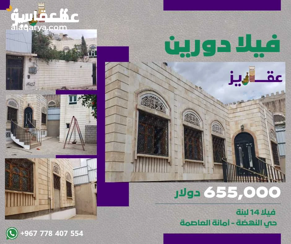 🏘️ `♥︎ يوجد فلة ضخمة للبيع .` 📏 *المساحة:* 14 لبنة - البناء في 7 لبن + خزان أرضي كبير 🧱 مسلح مثنى حجر كامل - تم البناء مع أعمدة وقواعد وجدار حامل 🧑🏻🔧 البناء والتشطيب *شخصي* بمواصفات وجودة عالية 🚪 *الحوش:* له مدخل كبير وصغير مستقل للملحق الأمامي - الحوش بواجهة الأرضية مع ساتر حديدي حول الفلة - يتسع لأكثر من 6 سيارات - بها حديقة وأشجار 🚧 *الملحق الأمامي* 2 أدوار ومستقل عن الفلة : ~(الدور الأول)~ مجلس مع حمام مستقل - ~(الدور الثاني)~ مجلس جنوبي غربي مع حمام مستقل - ~(الحوش الخلفي)~ غرفة للتنور وغرفة غسيل وغرفة شغالة مع حمام مستقل . 🚏 *#يوجد 3 مداخل للفيلا:* - *مدخل* من الحوش *الأمامي* للفيلا في *الواجهة الجنوبية* من اتجاه المجلس المركزي المطل على الحوش والحديقة. - *المدخل الشرقي* من البدروم. - *المدخل الغربي* مؤدي إلى غرف النوم والبدروم وبيت الدرج 🛖 *البدروم*: كبير وواسع - مفتوح بمساحة الفيلا - فيه غرفة ومطبخ واسع ومخزن وحمام - له مدخل مستقل من *الشرق* ومن *المدخل الغربي* متصل بصالات غرف النوم . ⛩️ *الدور الأول:* 3 صالات كبيرة - مجلس كبير مستقل المدخل بغرف استقبال وحمام - 3 غرف نوم بحمام كبير - غرفة نوم رئيسية بحمام كبير مستقل . 📍 *الموقع:* حي النهضة - أمانة العاصمة 💰 *السعر:* 655,000 $ دولار تطلع عليك اللبنة ب25,078,000 ﷼.ي 🛑 *العرض من المالك مباشرة* 📷 *يوجد صور للمنزل* 🔴═══༅༄༅ ✰ ༅༄༅═══🔴 🪀 *للتواصل:* https://api.whatsapp.com/send?phone=967778407554 *778407554* 🛑 ~في بعض الأحيان لا أرد على الاتصالات بسبب انشغالي وابتعادي عن الجوال~ *《 عقاريز - للخدمات العقارية 》* _إعلان رقم 202#_