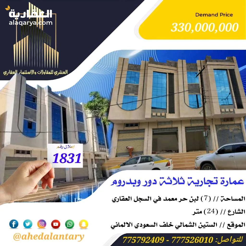 عرض رقم (1831) عمارة تجارية ثلاثة دور وبدروم سوبر لوكس في قمة الروعة والجمال.. المساحة // (7) لبن حر معمد في السجل العقاري.. الشارع // (24) متر.. الموقع // الستين الشمالي خلف السعودي الالماني امام مدينة بنك سبأ.. السعر // (330,000,000) ثلاثمائة وثلاثين مليون ريال.. التفاصيل: عمارة تجارية ثلاثة دور وبدروم سوبر لوكس في قمة الروعة والجمال.. - البدروم مفتوح كامل.. - الدور الاول يتكون من ثلاث فتحات تجارية وجراش سيارة وخزان ارضي بالإضافة إلى غرفة حارس.. وشقة تتكون من غرفتين وصالة وحمامين ومطبخ.. - الدور الثاني يتكون من شقتين شقة تتكون من (جناح عائلي غرف نوم مع الحمام) وغرفتين وصالة وحمام ومطبخ ومجلس وحمام.. وشقة تتكون من ثلاث غرف وحمامين ومطبخ وصالة.. - الدور الثالث نفس تصميم الدور الثاني.. 💫 صممت الأساسات لتحمل عدد ستة دور وملحق وطيرمانة.. 💫 بالإضافة إلى تشطيبات سوبر لوكس.. 💫 عمل كامل درجة اولى.. 💫 بالإضافة إلى انها قريبة جدا من شارع المطار.. 💫 بالإضافة إلى حي راقي جدا.. 💫 بالإضافة إلى اساس اصنصير مصعد كهربائي.. 💫 جميع المواد المستخدمة درجة أولى.. 💫 بالإضافة إلى خزان ارضي يتسع خمسة وايتات.. 💫 بالإضافة إلى جراش للسيارات.. 💫 بالإضافة إلى واجهة حجر.. 💫 العمل تحت اشراف اكبر المهندسين.. 💫 توثيق كامل ( صور + فيديو ) لجميع مراحل العمل.. ⭕ الاشراف عليه من البداية وتحت اشراف كادر هندسي متميز ذوي الكفات العالية.. *وميزات اخرى ستتعرف عليها وستشاهدها عند زيارتك لها* """""""""""""""""""""""""""""""""""""""" ★ ـــــ👇🏻ـــــ🏢ــــ👇🏻ـــــ★ للتواصـل معنا الإتصال عبر الأرقـام التالية: 📱 775792409 📢 لـ نشر عروضكم الخاصة { بيت " عمارة " أرض " فلة " شقق ايجار " شقق تمليك " وجميع الخدمات العقارية } وعرضة للبيع أو للأيجار التواصل مع إدارة التسويق على الرقم 📱 775792409📱 ____________________★ لـمشاهـدة جميع عروضـنا الممـيزة والحصرية أنضم لصفحـتنا الخـاصة على فيسـبوك https://www.facebook.com/antri.ye ____________________★ وللتواصل عبر الواتس مباشرة يرجى الضغط على الرابط التالي... https://wa.me/967775792409 ____________________★ رابط قناتنا على: https://youtube.com/@ahedalantary ____________________★ رابط الفيديو على اليوتيوب: https://youtu.be/xzRSOvvd134 ____________________★