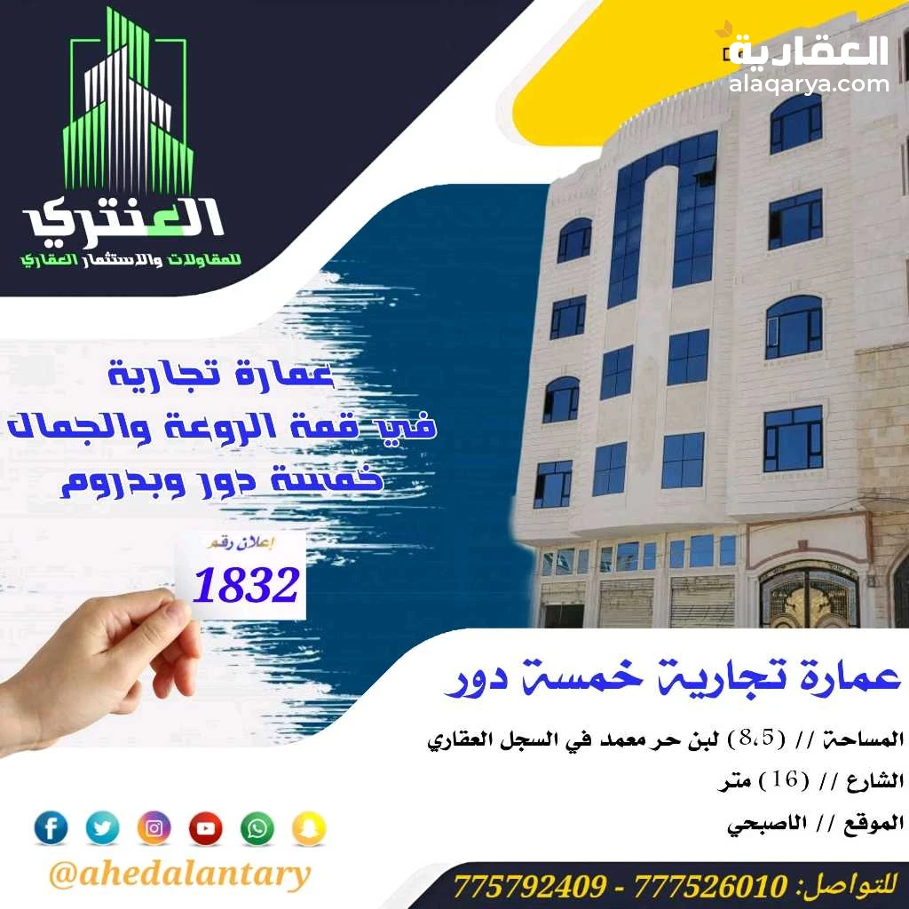 "نعطي اهتمام بالغ بالتطوير الدائم.. والارتقاء بجودة.. وتنوع خدماتها.. التي من شأنها تقديم الأفضل لعملائنا" نقدم لكم : عرض رقم (1832) *عمارة تجارية في قمة الروعة والجمال خمسة دور وبدروم* المساحة // (8,5) لبن حر معمد في السجل العقاري.. الشارع // (16) متر.. الموقع // الاصبحي.. السعر // (1,000,000 $) مليون دولار قابل للتفاوض.. التفاصيل: - البدروم مفتوح كامل تنزل السيارة للبدروم.. - الدور الاول يتكون من ثلاث فتحات تجارية وخزان ارضي وشقة في الخلف تتكون من (جناح عائلي غرف نوم مع الحمام) وغرفتين ومطبخ وحمام وصالة بمدخل عائلي ومجلس وحمام بمدخل مستقل.. - الدور الثاني يتكون من شقتين كل شقة تتكون من (جناح عائلي غرف نوم مع الحمام) وغرفتين ومطبخ وحمام وصالة بمدخل عائلي ومجلس وحمام بمدخل مستقل.. - الدور الثالث والدور الرابع والدور الخامس نفس الدور الثاني.. ⭐مميزاتها⭐ 💫 تشطيبات ديلوكس في قمة الرووعة والجمال .. 💫 صممت الأساسات لتحمل عدد سبعة دور وطيرمانة.. 💫 عمل كامل درجة اولى.. 💫 بالإضافة إلى موقع ذهبي.. 💫 جميع المواد المستخدمة درجة أولى.. 💫 بالإضافة إلى خزان ارضي يتسع ل ثمانية وايتات.. 💫 بالإضافة إلى عصنصير.. 💫 بالإضافة إلى واجهة حجر.. 💫 توثيق كامل ( صور + فيديو ) لجميع مراحل العمل.. *وميزات اخرى ستتعرف عليها وستشاهدها عند زيارتك لها* """"""""""""""""""""""""""""""""""""""""" ★ ـــــ👇🏻ـــــ🏢ــــ👇🏻ـــــ★ للتواصـل معنا الإتصال عبر الأرقـام التالية: 📱 775792409 📢 لـ نشر عروضكم الخاصة { بيت " عمارة " أرض " فلة " شقق ايجار " شقق تمليك " وجميع الخدمات العقارية } وعرضة للبيع أو للأيجار التواصل مع إدارة التسويق على الرقم 📱 775792409📱 ____________________★ لـمشاهـدة جميع عروضـنا الممـيزة والحصرية أنضم لصفحـتنا الخـاصة على فيسـبوك https://www.facebook.com/antri.ye ____________________★ وللتواصل عبر الواتس مباشرة يرجى الضغط على الرابط التالي... https://wa.me/967775792409 ____________________★ رابط قناتنا على: https://youtube.com/@ahedalantary ____________________★ رابط الفيديو https://youtu.be/5YGXqZLIBlY ____________________★