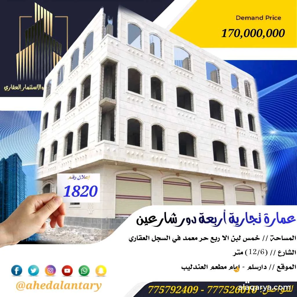 "عرض رقم (1820) - عمارة تجارية فاخرة للبيع في دارسلم المساحة: خمس لبن إلا ربع حر معمد في السجل العقاري الشارع: 12/6 متر الموقع: دارسلم - أمام مطعم العندليب السعر: 170,000,000 ريال التفاصيل: عمارة تجارية أربعة دور شارعين، وتتكون من: الدور الأول: - أربع فتحات تجارية - جراش سيارة - خزان أرضي - شقة في الخلف الدور الثاني: - شقتين كل شقة تتكون من: - ثلاث غرف - مطبخ - حمام - صالة بمدخل عائلي - مجلس وحمام بمدخل مستقل الدور الثالث: نفس تصميم الدور الثاني الدور الرابع: باقي له السقف فقط المميزات: - صممت الأساسات لتحمل عدد خمسة دور وطيرمانة - جميع المواد المستخدمة درجة أولى - عمل كامل درجة أولى - تهوية من جميع الجهات - قريبة من شارع الخمسين - خزان أرضي - جراش سيارة - واجهتين حجر - حي راقي جدا يتوسط جميع الخدمات العامة (حدائق، مدارس، أسواق، مستشفيات) - توثيق كامل لجميع مراحل العمل (صور + فيديو) *لمزيد من المعلومات والزيارة، يرجى التواصل مع:* - العنتري للمقاولات والاستثمار العقاري - رقم الهاتف: 777526010 📞 775792409 📞 صفحتنا على الفيس بوك: (https://www.facebook.com/antri.ye/) واتساب: (https://wa.me/967775792409) قناة العقارات على واتساب: (https://whatsapp.com/channel/0029Va8yDxWGZNCzotxGlr1U) قناة التيليجرام: (https://t.me/+3HX_fv_09wNhYmJk) قناة اليوتيوب: (https://youtube.com/@ahedalantary) *تنويه:* يوجد لدينا مخزون هائل من العروض العقارية المتنوعة. جميع عقاراتنا من الملاك رأسا. الأسعار تتغير حسب أسعار الصرف والوضع الاقتصادي.