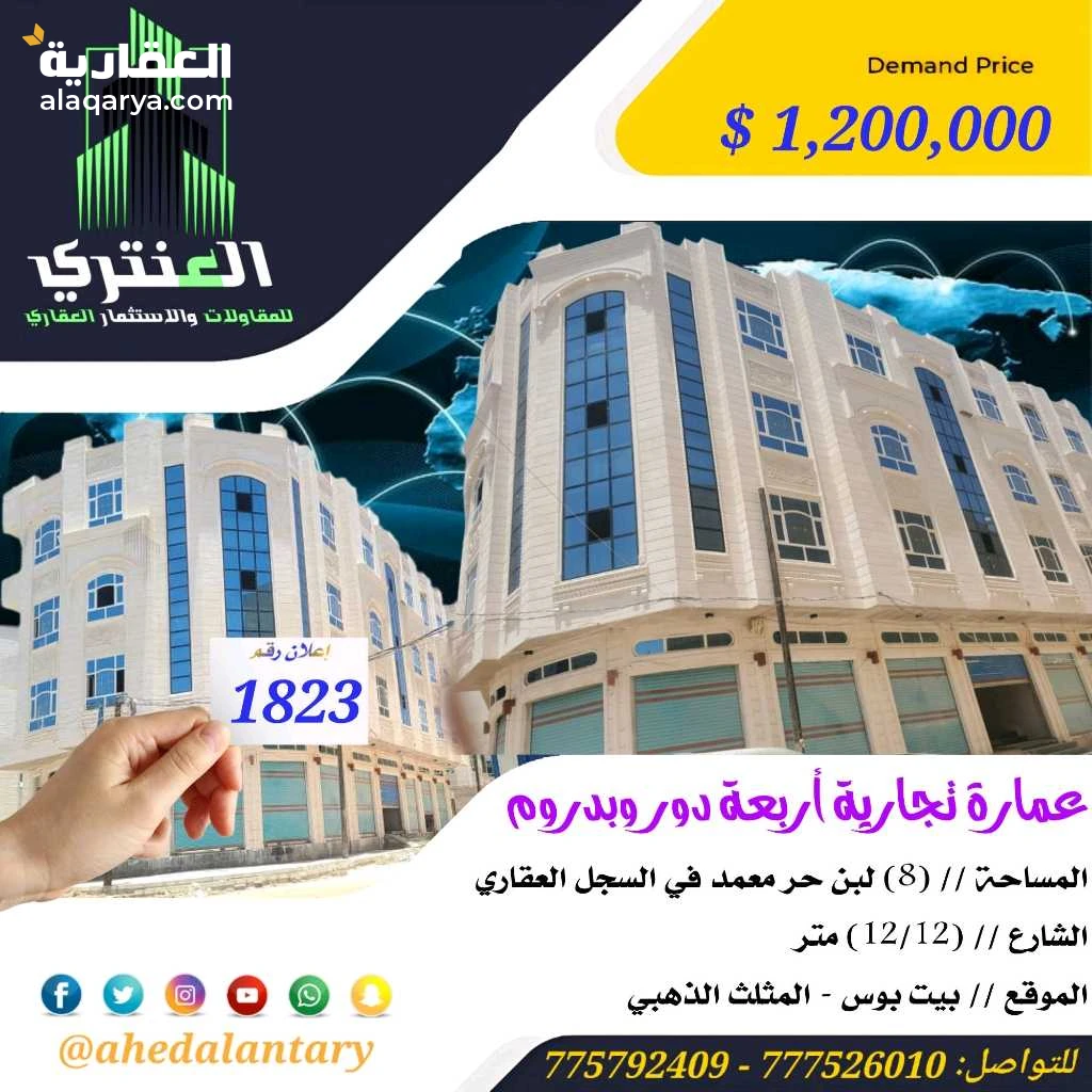 "نعطي اهتمام بالغ بالتطوير الدائم.. والارتقاء بجودة.. وتنوع خدماتها.. التي من شأنها تقديم الأفضل لعملائنا" نقدم لكم : عرض رقم (1823) عمارة تجارية أربعة دور وبدروم شارعين في قمة الروعة والجمال... المساحة // (8) لبن حر معمد في السجل العقاري.. الشارع // (12/12) متر.. الموقع // بيت بوس - المثلث الذهبي.. السعر // (1,200,000 $) مليون ومائتين الف دولار قابل للتفاوض.. التفاصيل: عمارة تجارية أربعة دور وبدروم شارعين في قمة الروعة والجمال... - البدروم مفتوح كامل مواقف للسيارات.. - الدور الاول يتكون من تسع فتحات تجارية ومدخل سيارة للبدروم وخزان ارضي وشقتين في الخلف كل شقة تتكون من غرفتين وصالة وحمام ومطبخ.. - الدور الثاني يتكون من شقتين كل شقة تتكون من (جناح عائلي غرف نوم مع الحمام) وثلاث غرف نوم وصالة وحمام ومطبخ بمدخل عائلي ومجلس وحمام وصالة بمدخل مستقل.. - الدور الثالث والدور الرابع نفس تصميم الدور الثاني.. 💫 صممت الأساسات لتحمل عدد سبعة دور وملحق وطيرمانة.. 💫 عمل كامل درجة اولى.. 💫 بالإضافة إلى تشطيب سوبر لوكس.. 💫 بالإضافة إلى حي راقي جدا.. 💫 جميع المواد المستخدمة درجة أولى.. 💫 بالإضافة إلى خزان ارضي يتسع ل خمسة وايتات.. 💫 بالإضافة إلى مدخل سيارات للبدروم.. 💫 بالإضافة إلى واجهتين حجر.. 💫 توثيق كامل ( صور + فيديو ) لجميع مراحل العمل.. *وميزات اخرى ستتعرف عليها وستشاهدها عند زيارتك لها* """"""""""""""""""""""""""""""""""""""""" ★ ـــــ👇🏻ـــــ🏢ــــ👇🏻ـــــ★ للتواصـل معنا الإتصال عبر الأرقـام التالية: 📱 775792409 📢 لـ نشر عروضكم الخاصة { بيت " عمارة " أرض " فلة " شقق ايجار " شقق تمليك " وجميع الخدمات العقارية } وعرضة للبيع أو للأيجار التواصل مع إدارة التسويق على الرقم 📱 775792409📱 ____________________★ لـمشاهـدة جميع عروضـنا الممـيزة والحصرية أنضم لصفحـتنا الخـاصة على فيسـبوك https://www.facebook.com/antri.ye ____________________★ وللتواصل عبر الواتس مباشرة يرجى الضغط على الرابط التالي... https://wa.me/967775792409 ____________________★ رابط قناتنا على: https://youtube.com/@ahedalantary ____________________★