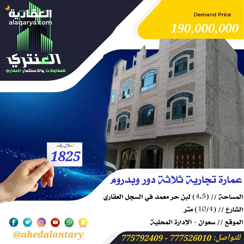 عرض رقم (1825) عمارة تجارية ثلاثة أدوار وبدروم بتشطيب سوبر لوكس. - المساحة: 4.5 لبن حر معمد في السجل العقاري. - الشارع: 10/4 متر. - الموقع: سعوان - الإدارة المحلية. - السعر: 190,000,000 ريال (قابل للتفاوض). تفاصيل العقار: - البدروم: مفتوح بالكامل على العظم. - الدور الأول: - فتحتان تجارية. - جراج سيارة. - خزان أرضي. - شقة في الخلف مكوّنة من غرفتين، صالة، حمام، مطبخ بمدخل عائلي، مجلس وحمام بمدخل مستقل. - الدور الثاني والثالث: - كل دور يحتوي على شقتين، كل شقة تتكون من غرفتين، صالة، حمام، مطبخ بمدخل عائلي، مجلس وحمام بمدخل مستقل. - مشطب بتشطيبات سوبر لوكس. العقار مشطب بالكامل باستثناء الدور الأول والبدروم. مميزات إضافية: - الأساسات مصممة لتحمل 5 أدوار إضافية مع ملحق وطيرمانة. - جميع الأعمال تمت بدرجة أولى باستخدام أفضل المواد. - خزان أرضي يتسع لـ 5 وايتات. - جراش للسيارات. - واجهة حجر أنيقة. - توثيق كامل (صور + فيديو) لجميع مراحل العمل. ومزايا أخرى ستكتشفها عند زيارتك للعقار. #العنتري_للمقاولات_والإستثمار_العقاري نقدم لكم أفضل الخدمات والعروض في عالم العقارات بمصداقية واحترافية عالية. للتواصل: - (777526010) 📞 - (775792409) 📞 🌐 تابعنا لمعرفة جميع عروضنا: صفحتنا على الفيسبوك (https://www.facebook.com/antri.ye/) للتواصل عبر الواتساب مباشرة (https://wa.me/967775792409) قناتنا على الواتساب (https://whatsapp.com/channel/0029Va8yDxWGZNCzotxGlr1U) قناتنا على التليجرام (https://t.me/+3HX_fv_09wNhYmJk) قناتنا على يوتيوب (https://youtube.com/@ahedalantary) 🔴 تنويه مهم: - لدينا مخزون هائل من العروض العقارية تشمل: فِلل، عمائر تجارية، مزارع، أراضي استثمارية عملاقة. - جميع عقاراتنا مباشرة من المالك، بدون وسطاء. 💡عند زيارتك لنا، ستكتشف المزيد من المزايا والخدمات المميزة التي نقدمها!