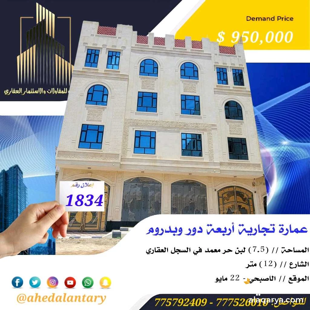 عرض رقم (1834) عمارة تجارية أربعة دور وبدروم سوبر لوكس.. المساحة // (7.5) لبن حر معمد في السجل العقاري.. الشارع // (12) متر.. الموقع // الاصبحي - 22 مايو.. السعر // (950,000 $) تسعمائة وخمسين الف دولار قابل للتفاوض.. التفاصيل: عمارة تجارية أربعة دور وبدروم سوبر لوكس.. - البدروم مفتوح كامل بالاضافة الى مدخل سيارات الى البدروم.. - الدور الاول يتكون من ثلاث فتحات تجارية وجراش للسيارات ومدخل من الشارع منفصل وخزان ارضي وشقة في الخلف تتكون من ثلاث غرف ومطبخ وحمام وصالة بمدخل عائلي ومجلس وحمام بمدخل مستقل.. - الدور الثاني يتكون من شقتين كل شقة تتكون من (جناح عائلي غرف نوم مع الحمام) وغرفتين وصالة وحمام ومطبخ واسع بمدخل عائلي ومجلس وحمام وصالة بمدخل مستقل.. - الدور الثالث والدور الرابع نفس تصميم الدور الثاني.. 💫 صممت الأساسات لتحمل عدد ستة دور وملحق وطيرمانة.. 💫 بالإضافة إلى تشطيبات سوبر لوكس.. 💫 عمل كامل درجة اولى.. 💫 بالإضافة إلى موقع ذهبي.. 💫 جميع المواد المستخدمة درجة أولى.. 💫 بالإضافة إلى خزان ارضي يتسع ل ستة وايتات.. 💫 بالإضافة إلى جراش للسيارت.. 💫 بالإضافة إلى مدخل للسيارات الى البدروم.. 💫 بالإضافة إلى حوش دوران.. 💫 بالإضافة إلى واجهة حجر.. 💫 بالإضافة إلى توثيق كامل ( صور + فيديو ) لجميع مراحل العمل.. *وميزات اخرى ستتعرف عليها وستشاهدها عند زيارتك لها* """"""""""""""""""""""""""""""""""""""""" ★ ـــــ👇🏻ـــــ🏢ــــ👇🏻ـــــ★ للتواصـل معنا الإتصال عبر الأرقـام التالية: 📱 775792409 📢 لـ نشر عروضكم الخاصة { بيت " عمارة " أرض " فلة " شقق ايجار " شقق تمليك " وجميع الخدمات العقارية } وعرضة للبيع أو للأيجار التواصل مع إدارة التسويق على الرقم 📱 775792409📱 ____________________★ لـمشاهـدة جميع عروضـنا الممـيزة والحصرية أنضم لصفحـتنا الخـاصة على فيسـبوك https://www.facebook.com/antri.ye ____________________★ وللتواصل عبر الواتس مباشرة يرجى الضغط على الرابط التالي... https://wa.me/967775792409 ____________________★ رابط قناتنا على: https://youtube.com/@ahedalantary ____________________★ رابط الفيديو على اليوتيوب: https://youtu.be/mWwGNIToy2U ____________________★