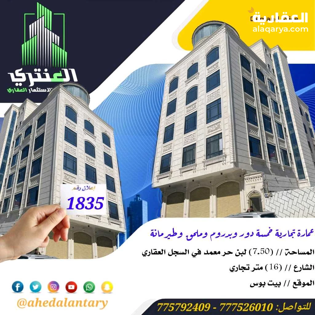 عرض رقم (1835) عمارة تجارية خمسة دور وبدروم وملحق وطيرمانة سوبر لوكس.. المساحة // (7.50) لبن حر معمد في السجل العقاري.. الشارع // (16) متر تجاري.. الموقع // بيت بوس.. السعر // (1,200,000 $) مليون ومائتين الف دولار قابل للتفاوض.. التفاصيل: البدروم مفتوح كامل - الدور الاول يتكون من ثلاث فتحات تجارية وخزان ارضي وشقة في الخلف.. - الدور الثاني يتكون من شقتين كل شقة تتكون من ثلاث غرف ومطبخ وحمام وصالة بمدخل عائلي ومجلس وحمام بمدخل مستقل.. *مميزاتها* *💫 صممت الأساسات لتحمل عدد ستة دور وملحق وطيرمانة..* *💫 تأسيسات الكهرباء و السباكة درجة أولى..* *💫 بالإضافة إلى تشطيبات سوبر لوكس..* *💫 جميع المواد المستخدمة درجة أولى..* *💫 بالإضافة إلى خزان ارضي يتسع ل خمسة وايتات..* *💫 بالإضافة إلى حجر دوران..* *💫 توثيق كامل ( صور + فيديو ) لجميع مراحل العمل..* *وميزات اخرى ستتعرف عليها وستشاهدها عند زيارتك لها* """"""""""""""""""""""""""""""""""""""""" #العنتري_للمقاولات_والإستثمار_العقاري للتواصل: (777526010)📞 (775792409)📞 لمتابعة جميع عروضنا عبر صفحتنا على منصة الفيس بوك: https://www.facebook.com/antri.ye/ وللتواصل عبر الواتس مباشرة يرجى الضغط على الرابط التالي... https://wa.me/967775792409 رابط قناتنا على: youtube https://youtube.com/@ahedalantary 🔴 تنويه لعملائنا الكرام ومتابعينا الأعزاء يوجد لدينا مخزون هائل من العروض العقارية للفل والعمائر التجارية والمزارع والأرضي الإستثمارية العملاقة. 🔴 ملاحظة: جميع عقاراتنا من الملاك رأسا. 🔴 ملاحظة: الأسعار تتغير نتيجة لتفاوت أسعار الصرف والوضع الاقتصادي للبلد. 🌐🌐🌐🌐🌐🌐🌐🌐🌐🌐🌐🌐🌐🌐🌐🌐🌐🌐🌐