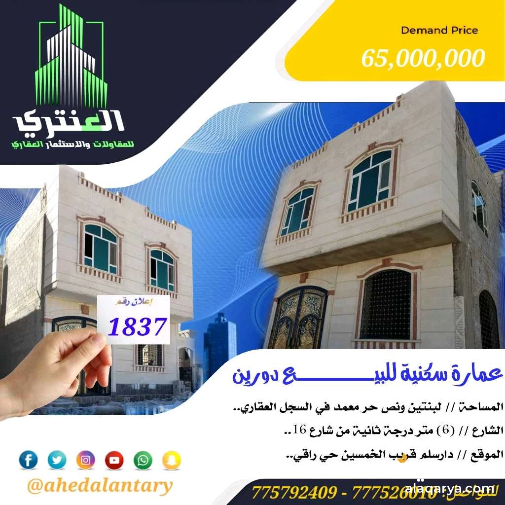 عرض رقم (1837) عمارة سكنية للبيـــــــــــــــــــع دورين بسعر مناسب ومغري جدا.. المساحة // لبنتين ونص حر معمد في السجل العقاري.. الشارع // (6) متر درجة ثانية من شارع 16.. الموقع // دارسلم قريب الخمسين حي راقي.. السعر // (65,000,000) خمسة وستين مليون ريال.. التفاصيل: العمارة دورين مشطب الدور الثاني لوووووووكس - الدور الأول يتكون من مجلس + حمام وغرفتين ومطبخ وحمام وصالة وقراش سياره وخزان ارضي.. - الدورالثاني يتكون من مجلس + حمام مدخل خاص وايضاً ثلاث غرف نوم وحمامين ومطبخ وصالة العمل ممتاز جداً مسلح هردي قواعد العرض مضمون من المالك رائسا عبرنا والمخططات موجودة لدينا *لمشاهدة الفيديو على اليوتيوب:* https://youtu.be/iOUhGpOEknc?si=MNBTMCsXiwPcZLOz *وميزات اخرى ستتعرف عليها وستشاهدها عند زيارتك لها* """"""""""""""""""""""""""""""""""""""""" ★ ـــــ👇🏻ـــــ🏢ــــ👇🏻ـــــ★ للتواصـل معنا الإتصال عبر الأرقـام التالية: 📱 775792409 📢 لـ نشر عروضكم الخاصة { بيت " عمارة " أرض " فلة " شقق ايجار " شقق تمليك " وجميع الخدمات العقارية } وعرضة للبيع أو للأيجار التواصل مع إدارة التسويق على الرقم 📱 775792409📱 ____________________★ لـمشاهـدة جميع عروضـنا الممـيزة والحصرية أنضم لصفحـتنا الخـاصة على فيسـبوك https://www.facebook.com/antri.ye ____________________★ وللتواصل عبر الواتس مباشرة يرجى الضغط على الرابط التالي... https://wa.me/967775792409 ____________________★ رابط قناتنا على: https://youtube.com/@ahedalantary ____________________★