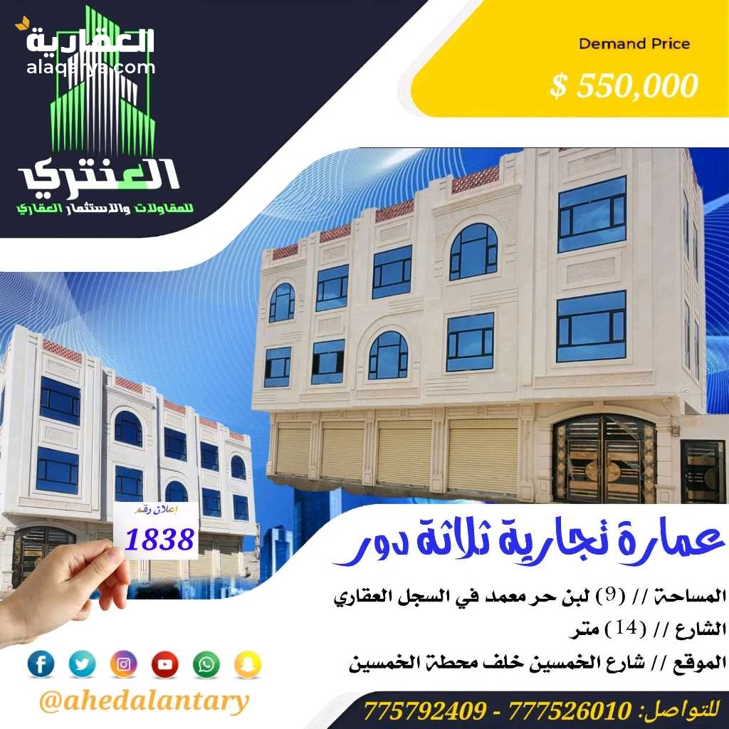 شعارنا ..ثقة - ربح - أمان .. وكما وعدناكم بمفاجآت عديدة خلال وتلبية لاحتياجاتكم ورغباتكم، نقدم لكم: عرض رقم (1538) عمارة تجارية ثلاثة دور سوبر لوكس... المساحة // (9) لبن حر معمد في السجل العقاري.. الشارع // (14) متر.. الموقع // شارع الخمسين خلف محطة الخمسين - حي الشباب.. السعر // (550,000 $) خمسمائة وخمسين الف دولار.. التفاصيل: عمارة تجارية ثلاثة دور سوبر لوكس... - الدور الاول يتكون من أربع فتحات تجارية وجراش للسيارات وخزان ارضي وشقة في الخلف تتكون من (جناح عائلي غرف نوم مع الحمام) وغرفتين وصالة وحمام ومطبخ بمدخل عائلي ومجلس وحمام بمدخل مستقل.. - الدور الثاني يتكون من شقتين كل شقة تتكون من (جناح عائلي غرف نوم مع الحمام) وغرفتين ومطبخ وحمام وصالة جانبية واسعة بمدخل عائلي ومجلس وحمام بمدخل مستقل.. 💫 صممت الأساسات لتحمل عدد ستة دور وطيرمانة.. 💫 عمل كامل درجة اولى.. 💫 بالإضافة إلى موقع ذهبي.. 💫 بالإضافة إلى تهوية من جميع الجهات.. 💫 جميع المواد المستخدمة درجة أولى.. 💫 بالإضافة إلى خزان أرضي يتسع ل خمسة وايتات.. 💫 بالإضافة إلى جراش للسيارات.. 💫 بالإضافة إلى واجهة حجر.. 💫 توثيق كامل ( صور + فيديو ) لجميع مراحل العمل.. *وميزات اخرى ستتعرف عليها وستشاهدها عند زيارتك لها* """"""""""""""""""""""""""""""""""""""""" ★ ـــــ👇🏻ـــــ🏢ــــ👇🏻ـــــ★ للتواصـل معنا الإتصال عبر الأرقـام التالية: 📱 775792409 📢 لـ نشر عروضكم الخاصة { بيت " عمارة " أرض " فلة " شقق ايجار " شقق تمليك " وجميع الخدمات العقارية } وعرضة للبيع أو للأيجار التواصل مع إدارة التسويق على الرقم 📱 775792409📱 ____________________★ لـمشاهـدة جميع عروضـنا الممـيزة والحصرية أنضم لصفحـتنا الخـاصة على فيسـبوك https://www.facebook.com/antri.ye ____________________★ وللتواصل عبر الواتس مباشرة يرجى الضغط على الرابط التالي... https://wa.me/967775792409 ____________________★ رابط قناتنا على: https://youtube.com/@ahedalantary ____________________★