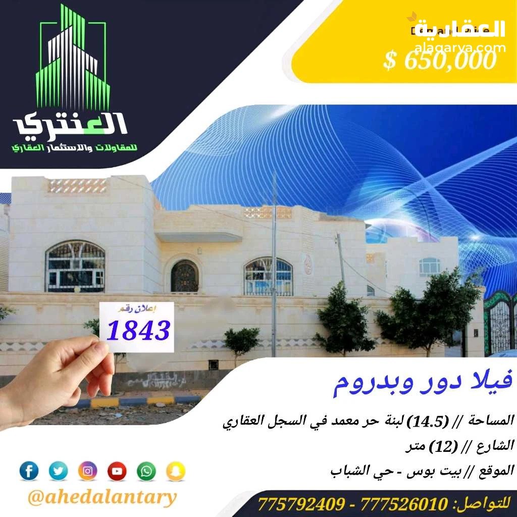 عرض رقم (1843) فيلا دور وبدروم.. المساحة // (14.5) لبنة حر معمد في السجل العقاري.. الشارع // (12) متر.. الموقع // بيت بوس - حي الشباب.. التفاصيل: - البدروم يتكون من صالة مفتوحة + مطبخ وحمام وغرفة وصالة. - الدور الاول يتكون من صالة استقبال مجلس وحمام مستقل + جناح عائلي + غرفتين ومطبخ وحمام وصالة. - فيها حوش كبير يتسع ل(12) سيارة، بالإضافة الى بوابتين. - يوجد فيها خزان ارضي كبير. - الفيلا ملبسة حجر دوران بالكامل بالإضافة الى حوش دوران تهوية. *وميزات اخرى ستتعرف عليها وستشاهدها عند زيارتك لها* """"""""""""""""""""""""""""""""""""""""" #العنتري_للمقاولات_والإستثمار_العقاري للتواصل: (777526010)📞 (775792409)📞 لمتابعة جميع عروضنا عبر صفحتنا على منصة الفيس بوك: https://www.facebook.com/antri.ye/ وللتواصل عبر الواتس مباشرة يرجى الضغط على الرابط التالي... https://wa.me/967775792409 رابط قناتنا على: youtube https://youtube.com/@ahedalantary 🔴 تنويه لعملائنا الكرام ومتابعينا الأعزاء يوجد لدينا مخزون هائل من العروض العقارية للفل والعمائر التجارية والمزارع والأرضي الإستثمارية العملاقة. 🔴 ملاحظة: جميع عقاراتنا من الملاك رأسا. 🔴 ملاحظة: الأسعار تتغير نتيجة لتفاوت أسعار الصرف والوضع الاقتصادي للبلد. 🌐🌐🌐🌐🌐🌐🌐🌐🌐🌐🌐🌐🌐🌐🌐🌐🌐🌐🌐