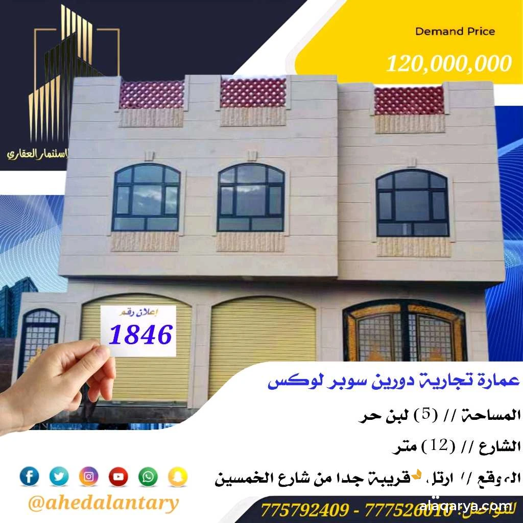عرض رقم (1846) عمارة تجارية دورين سوبر لوكس.. المساحة // (5) لبن حر.. الشارع // (12) متر.. الموقع // ارتل - قريبة جدا من شارع الخمسين.. السعر // (120,000,000) مائة وعشرين مليون ريال قابل للتفاوض.. التفاصيل: عمارة تجارية دورين سوبر لوكس.. - الدور الاول مكون مما يلي : فتحتين تجارية وجراش سيارة ومدخل عائلي مستقل و حوش خلفي مصمم حديقه روعه.. (يمكن تصميمها كشقه حيث تم عمل حساب ذلك في التقسيم والتسليك المدفون مثل مصارف المياه وانابيب تمديد الكهرباء لها) وكما يوجد خزان ارضي سعه خمسه وايتات.. - الدور الثاني يتكون من شقة كبيره بنظام فلة تتكون من ثلاث غرف (مساحة الغرف كبيرة ) مجلس كبير 3 حمامات في الدور صاله كبيره مطبخ/بوفية كبيره صاله داخلية كبيره - تخطيط العمارة رائع كما ان تصميم واساس العمارة مصممه لعدد 6 ادوار وملحق. - الارض حر مساحه خمس لبن عشاري. - يوجد توثيق كامل بالصور والفيديوهات لمراحل العمل والبناء والقواعد والصبيات. - موصل للعمارة الكهرباء والماء (تجاري). عماره مسلح شغل رقم واحد خرسانه مركزي باقي اللمبات ومفاتيح الكهرباء فقط(حيث ان السباكه والكهرباء جاهزه) الواجهه حجر بيضاء (مهوايه من جميع الجهات)... واجهه غربي.. بينها وبين شارع الخمسين ارتل.. ارضيه واحده فقط.. على شارع ١٢ متر.. *وميزات اخرى ستتعرف عليها وستشاهدها عند زيارتك لها* """"""""""""""""""""""""""""""""""""""""" #العنتري_للمقاولات_والإستثمار_العقاري للتواصل: (777526010)📞 (775792409)📞 لمتابعة جميع عروضنا عبر صفحتنا على منصة الفيس بوك: https://www.facebook.com/antri.ye/ وللتواصل عبر الواتس مباشرة يرجى الضغط على الرابط التالي... https://wa.me/967775792409 رابط قناتنا على: youtube https://youtube.com/@ahedalantary 🔴 تنويه لعملائنا الكرام ومتابعينا الأعزاء يوجد لدينا مخزون هائل من العروض العقارية للفل والعمائر التجارية والمزارع والأرضي الإستثمارية العملاقة. 🔴 ملاحظة: جميع عقاراتنا من الملاك رأسا. 🔴 ملاحظة: الأسعار تتغير نتيجة لتفاوت أسعار الصرف والوضع الاقتصادي للبلد. 🌐🌐🌐🌐🌐🌐🌐🌐🌐🌐🌐🌐🌐🌐🌐🌐🌐🌐🌐