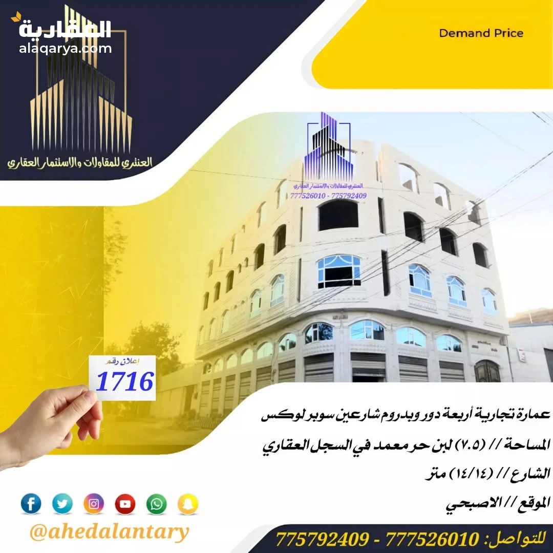 عرض رقم (1716) عمارة تجارية أربعة دور وبدروم شارعين سوبر لوكس.. المساحة // (7.5) لبن حر معمد في السجل العقاري.. الشارع // (14/14) متر.. الموقع // الاصبحي.. السعر // (1,000,000 $) مليون دولار قابل للتفاوض.. التفاصيل: - البدروم مفتوح كامل كبير مشطب - الدور الاول يتكون من تسع فتحات تجارية وجراش سيارة وخزان ارضي وفتحة للبدروم مشطب.. - الدور الثاني يتكون من شقتين كل شقة تتكون من (جناح عائلي غرف نوم مع الحمام) و غرفتين وصالة كبيرة وحمام عائلي ومطبخ كبير بمدخل عائلي ومجلس وحمام وصالة بمدخل مستقل.. - الدور الثالث نفس تصميم الدور الثاني.. - الدور الرابع باقي له السقف فقط.. الموقع الاصبحي جوله الثقافه قريبه شارع الاربعين 💫 صممت الأساسات لتحمل عدد ثمانية دور وملحق وطيرمانة.. 💫 قريبة جدا من الشارع العام والاسوق.. 💫 الاوراق معمدة وموثقة في السجل العقاري.. 💫 عمل كامل درجة اولى.. 💫 الموقع ارقئ واجمل الاحياء الراقي والجميلة في امانة العاصمة.. 💫 بالإضافة إلى مصعد.. 💫 بالإضافة إلى خزان ارضي واسع.. 💫 بالإضافة إلى جراش.. 💫 بالإضافة إلى جهتين حجر.. 💫 توثيق كامل ( صور + فيديو ) لجميع مراحل العمل.. *وميزات اخرى ستتعرف عليها وستشاهدها عند زيارتك لها* """"""""""""""""""""""""""""""""""""""""" #العنتري_للمقاولات_والإستثمار_العقاري للتواصل: (777526010)📞 (775792409)📞 لمتابعة جميع عروضنا عبر صفحتنا على منصة الفيس بوك: https://www.facebook.com/antri.ye/ وللتواصل عبر الواتس مباشرة يرجى الضغط على الرابط التالي... https://wa.me/967775792409 للحصول على كل جديد في عالم العقارات تابعنا على قناة الواتساب.. https://whatsapp.com/channel/0029Va8yDxWGZNCzotxGlr1U رابط قناتنا على: youtube https://youtube.com/@ahedalantary 🔴 تنويه لعملائنا الكرام ومتابعينا الأعزاء يوجد لدينا مخزون هائل من العروض العقارية للفل والعمائر التجارية والمزارع والأرضي الإستثمارية العملاقة. 🔴 ملاحظة: جميع عقاراتنا من الملاك رأسا. 🔴 ملاحظة: الأسعار تتغير نتيجة لتفاوت أسعار الصرف والوضع الاقتصادي للبلد. 🌐🌐🌐🌐🌐🌐🌐🌐🌐🌐🌐🌐🌐🌐🌐🌐🌐🌐🌐