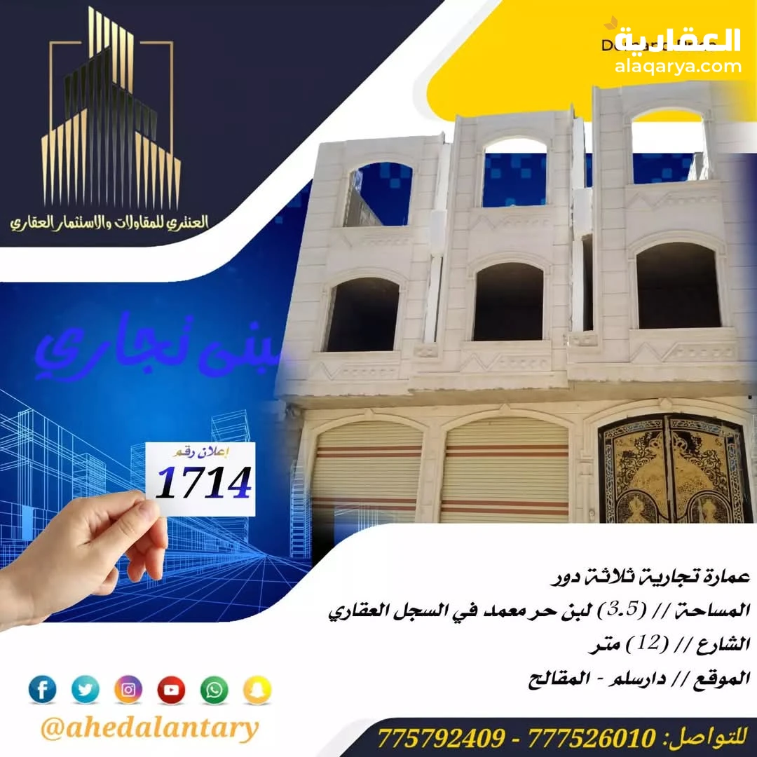 عرض رقم (1714) عمارة تجارية دورين عظم والدور الثالث لاحد السقف... المساحة // (3.5) لبن حر معمد في السجل العقاري.. الشارع // (12) متر.. الموقع // دارسلم - المقالح.. السعر // (85,000,000) خمسة وثمانين مليون ريال قابل للتفاوض.. التفاصيل: عمارة تجارية دورين عظم والدور الثالث لاحد السقف... - الدور الاول يتكون من فتحتين تجارية وجراش سيارة وخزان ارضي وشقة في الخلف تتكون من غرفتين وصالة وحمام ومطبخ بمدخل عائلي ومجلس وحمام بمدخل مستقل.. - الدور الثاني يتكون من شقتين كل شقة تتكون من غرفتين وصالة وحمام ومطبخ بمدخل عائلي ومجلس وحمام بمدخل مستقل.. - الدور الثالث باقي له السقف فقط.. 💫 صممت الأساسات لتحمل عدد خمسة دور وطيرمانة.. 💫 بالإضافة إلى عمل كامل درجة اولى.. 💫 جميع المواد المستخدمة درجة أولى.. 💫 بالإضافة إلى خزان ارضي يتسع ل اربعة وايتات.. 💫 بالإضافة إلى جراش سيارة.. 💫 بالإضافة إلى واجهة حجر.. 💫 توثيق كامل ( صور + فيديو ) لجميع مراحل العمل.. https://youtube.com/shorts/06d5BAz6Ua8?si=rCTWvo699AK4wlOC *وميزات اخرى ستتعرف عليها وستشاهدها عند زيارتك لها* """"""""""""""""""""""""""""""""""""""""" #العنتري_للمقاولات_والإستثمار_العقاري للتواصل: (777526010)📞 (775792409)📞 لمتابعة جميع عروضنا عبر صفحتنا على منصة الفيس بوك: https://www.facebook.com/antri.ye/ وللتواصل عبر الواتس مباشرة يرجى الضغط على الرابط التالي... https://wa.me/967775792409 للحصول على كل جديد في عالم العقارات تابعنا على قناة الواتساب.. https://whatsapp.com/channel/0029Va8yDxWGZNCzotxGlr1U رابط قناتنا على: youtube https://youtube.com/@ahedalantary 🔴 تنويه لعملائنا الكرام ومتابعينا الأعزاء يوجد لدينا مخزون هائل من العروض العقارية للفل والعمائر التجارية والمزارع والأرضي الإستثمارية العملاقة. 🔴 ملاحظة: جميع عقاراتنا من الملاك رأسا. 🔴 ملاحظة: الأسعار تتغير نتيجة لتفاوت أسعار الصرف والوضع الاقتصادي للبلد. 🌐🌐🌐🌐🌐🌐🌐🌐🌐🌐🌐🌐🌐🌐🌐🌐🌐🌐🌐