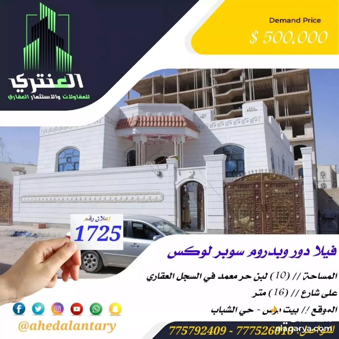 مفاجآتنا مستمرة .. رُقّيٌ مستمر.. وتقدّم ملحوظ.. وتطوّر مختلف.. وعروض منافسة.. نقدم لكم "عرض رقم (1725)" فيلا دور وبدروم سوبر لوكس.. المساحة // (10) لبن حر معمد في السجل العقاري.. على شارع // (16) متر.. الموقع // بيت بوس - حي الشباب.. السعر // (500,000 $) خمسمائة ألف دولار.. التفاصيل: - فيلا دور وبدروم سوبر لوكس.. البدروم يتكون من صالة مفتوحة ومطبخ مركزي وغرفة وحمام.. - الدور الأول يتكون من مجلس وحمام وصالة بمدخل مستقل.. بالإضافة إلى جناحين عائلية كل (جناح عائلي يحتوي على غرفة نوم مع الحمام) وغرفة وصالة ومطبخ وحمام.. 💫 صممت الأساسات لتحمل أربعة دور وملحق وطيرمانة.. 💫 بالإضافة إلى عمل كامل درجة اولى.. 💫 بالإضافة إلى موقع ذهبي.. 💫 جميع المواد المستخدمة درجة أولى.. 💫 بالإضافة إلى خزان أرضي.. 💫 بالإضافة إلى تشطيب سوبر لوكس.. 💫 بالإضافة إلى حوشين للسيارات.. 💫 بالإضافة إلى حجر دوران.. 💫 بالإضافة إلى تهوية من جميع الجهات.. 💫 بالإضافة إلى قريب جدا من الشارع العام والخدمات.. 💫 توثيق كامل ( صور + فيديو ) لجميع مراحل العمل.. *وميزات اخرى ستتعرف عليها وستشاهدها عند زيارتك لها* """"""""""""""""""""""""""""""""""""""""" #العنتري_للمقاولات_والإستثمار_العقاري للتواصل: (777526010)📞 (775792409)📞 لمتابعة جميع عروضنا عبر صفحتنا على منصة الفيس بوك: https://www.facebook.com/antri.ye/ وللتواصل عبر الواتس مباشرة يرجى الضغط على الرابط التالي... https://wa.me/967775792409 للحصول على كل جديد في عالم العقارات تابعنا على قناة الواتساب.. https://whatsapp.com/channel/0029Va8yDxWGZNCzotxGlr1U رابط قناتنا على: youtube https://youtube.com/@ahedalantary 🔴 تنويه لعملائنا الكرام ومتابعينا الأعزاء يوجد لدينا مخزون هائل من العروض العقارية للفل والعمائر التجارية والمزارع والأرضي الإستثمارية العملاقة. 🔴 ملاحظة: جميع عقاراتنا من الملاك رأسا. 🔴 ملاحظة: الأسعار تتغير نتيجة لتفاوت أسعار الصرف والوضع الاقتصادي للبلد. 🌐🌐🌐🌐🌐🌐🌐🌐🌐🌐🌐🌐🌐🌐🌐🌐🌐🌐🌐