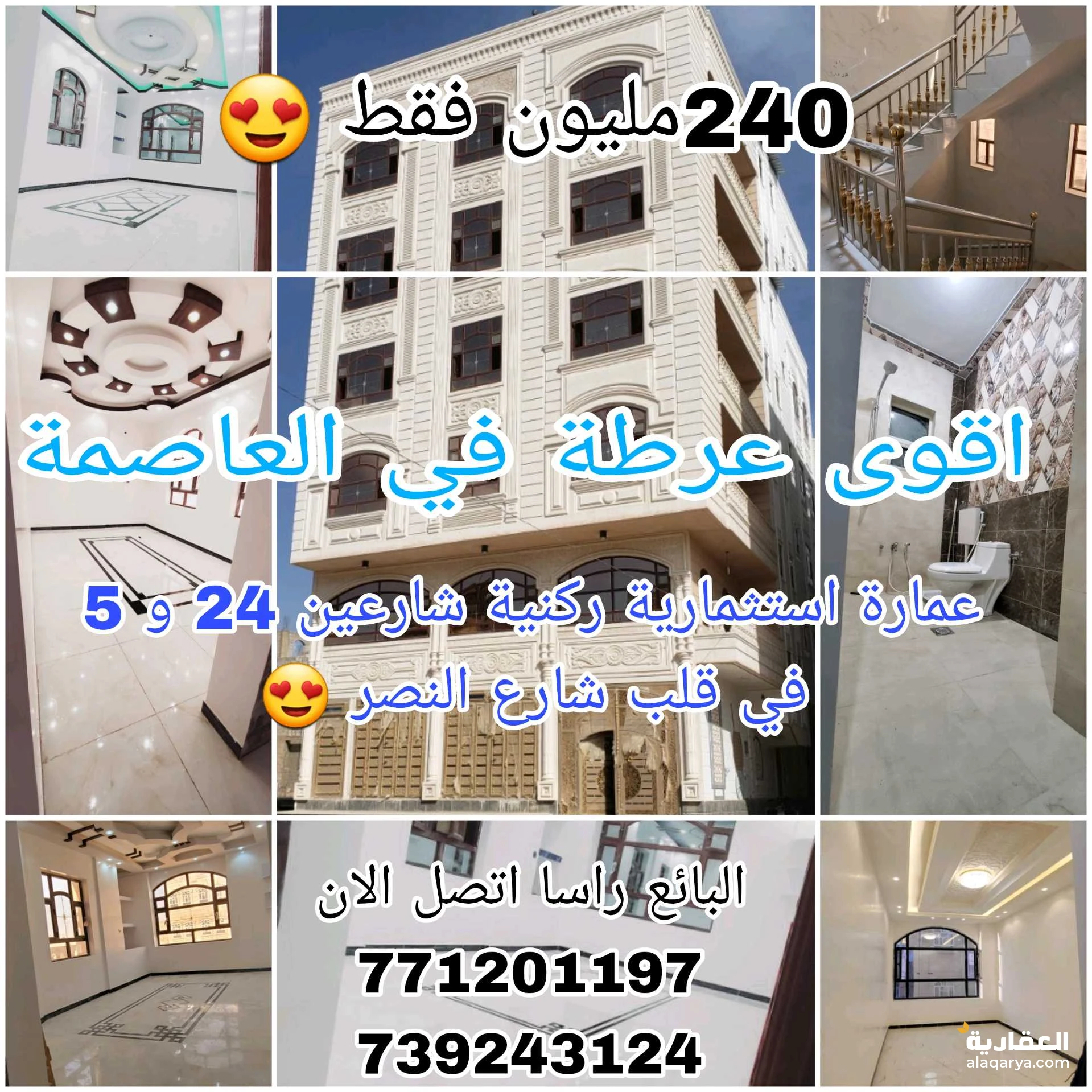 أقواء عررررطه في التاريخ العقارات عرررطه بامعنى الكلمه • يوجد لدينا عماره فخمه في ارقى احياء صنعاء من المالك شخصيا جاهز لوكس عمل هندسي فخم موثق بالصور والفيديوهات واشراف هندسي متميز • المساحة /5لبن حرمعمد في السجل العقاري • الشوارع /شارع 24وشارع 5 عدد الأدوار والشقق • تتكون من/خمسة دور وبدرون • و8شقق الدور الأول • الدور الاول 3فتحات عباره عن مخزن وقرش سياره وخزان ارضي واسع الأدوار من الثاني إلى الخامس • يحتوي كل دور علا شقتين مكونات الشقق • كل شقه تحتوي على ركززز • مجلس وحمام منفصل و3 • غرف نوم واسعه ومطبخ • وصاله وحمام عائلي الديكورات والتصامين المميزه • كما ان العماره مجهزه بااحدث الموقع • الموقع /قلب العاصمة صنعاء وفي أرقأ • المناطق مجاري وصرف صحي • شارع النصر محاذي للجراف الشرقي • السعر240مليون قابل للتفاوض باالمعقول العرض من المالك راسآ اتصل الان 771201197 - 739243124 783030671