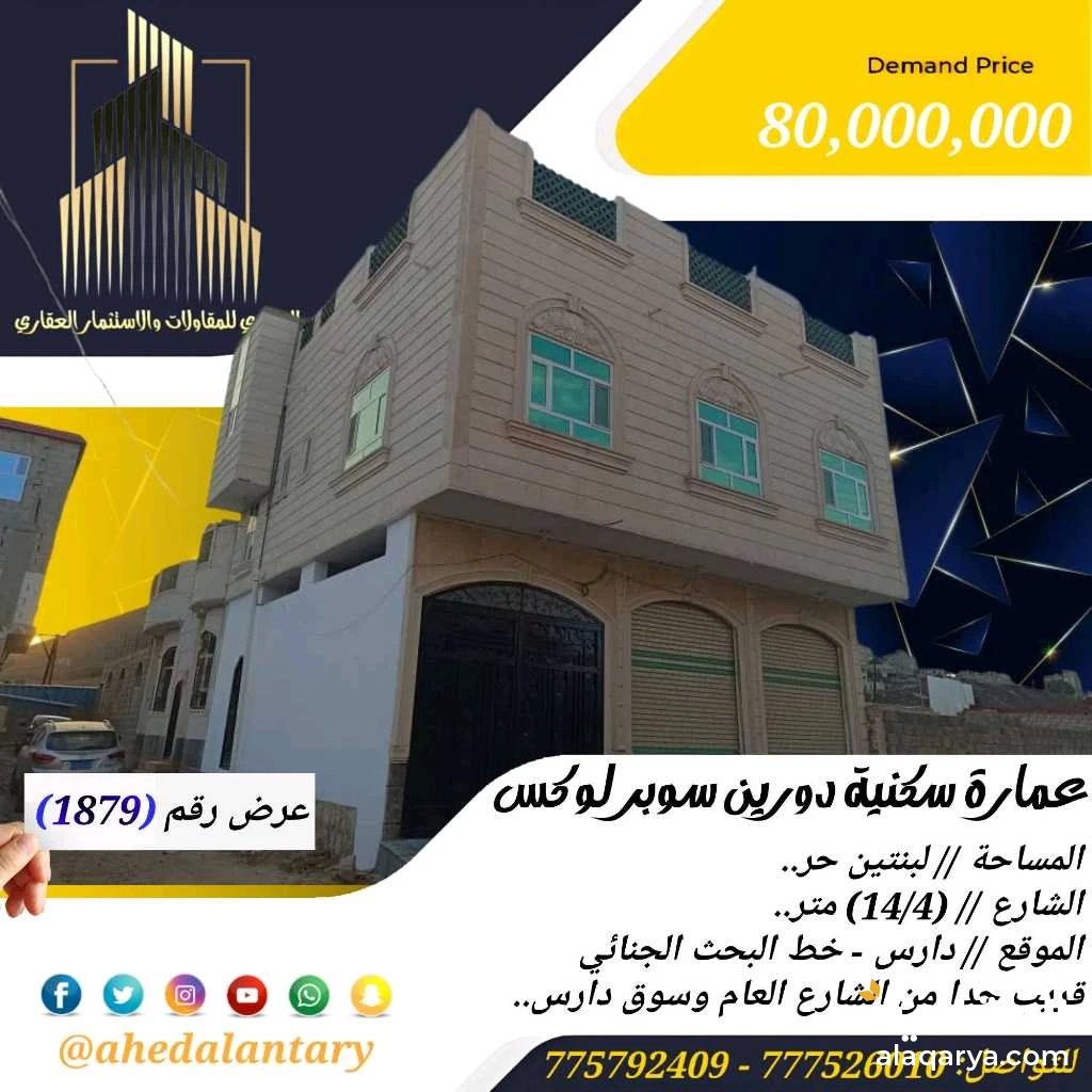 عرض رقم (1879) عمارة سكنية دورين سوبر لوكس.. المساحة // لبنتين حر.. الشارع // (14/4) متر.. الموقع // دارس - خط البحث الجنائي - قريب جدا من الشارع العام وسوق دارس.. السعر // (80,000,000) ثمانين مليون ريال قابل للتفاوض.. التفاصيل: عمارة سكنية دورين سوبر لوكس.. - الدور الأول يتكون من فتحتين تجارية وجراش سيارة وشقة في الخلف تتكون من غرفة وحمام ومطبخ وصالة.. - الدور الثاني يتكون من غرفتين وحمام ومطبخ وصالة جلوس بمدخل عائلي ومجلس وحمام بمدخل مستقل.. 💫 صممت الأساسات لتحمل عدد ستة دور.. 💫 عمل كامل درجة اولى.. 💫 تأسيسات الكهرباء و السباكة درجة أولى.. 💫 تسليك منفصل للسخان الشمسي.. 💫 الكهرباء فيها نظامين طاقة شمسية وكهرباء.. 💫 بالإضافة إلى تشطيب سوبر لوكس.. 💫 جميع المواد المستخدمة درجة أولى.. 💫 بالإضافة إلى خزان ارضي يتسع اثنين وايتات.. 💫 بالإضافة إلى واجهة شرقي عدني.. 💫 بالإضافة إلى واجهة حجر.. 💫 بالإضافة إلى قريب جدا من الشارع العام والخدمات والاسوق.. 💫 توثيق كامل ( صور + فيديو ) لجميع مراحل العمل.. *وميزات اخرى ستتعرف عليها وستشاهدها عند زيارتك لها* """"""""""""""""""""""""""""""""""""""""" #العنتري_للمقاولات_والإستثمار_العقاري للتواصل: (777526010)📞 (775792409)📞 لمتابعة جميع عروضنا عبر صفحتنا على منصة الفيس بوك: https://www.facebook.com/antri.ye/ وللتواصل عبر الواتس مباشرة يرجى الضغط على الرابط التالي... https://wa.me/967775792409 رابط قناتنا على: youtube https://youtube.com/@ahedalantary 🔴 تنويه لعملائنا الكرام ومتابعينا الأعزاء يوجد لدينا مخزون هائل من العروض العقارية للفل والعمائر التجارية والمزارع والأرضي الإستثمارية العملاقة. 🔴 ملاحظة: جميع عقاراتنا من الملاك رأسا. 🔴 ملاحظة: الأسعار تتغير نتيجة لتفاوت أسعار الصرف والوضع الاقتصادي للبلد. 🌐🌐🌐🌐🌐🌐🌐🌐🌐🌐🌐🌐🌐🌐🌐🌐🌐🌐🌐