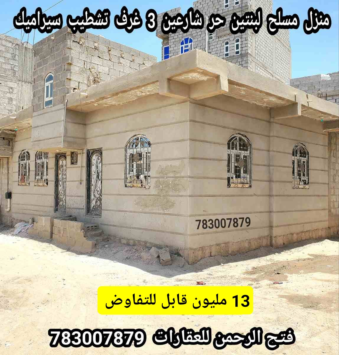 منزل للبيع مسلح شارعين مساحه لبنتين الا ثمن حر ب 13 مليون قابل للتفاوض } ➖➖➖➖➖➖➖➖➖➖➖➖➖ التفاصيل :- عدد الأدوار : 1 نوع البناء : مسلح عمدان . المساحه : لبنتين الا ثمن حر ومعمد في المحكمه وفي قلم التوثيق العقاري . الشارع : شارعين 6 و 6 متر وقريب للشارع الرئيسي . { مكون من مجلس وحمام بمدخل منفصل + مدخل اخر لغرفتين واسعه وحمام ومطبخ وصاله واسعه } تشطيب المنزل كامل سيراميك . ▪️المنزل يقع وسط حي سكني . ▪️متوفر كافه الخدمات ( ماء - كهرباء - جامع - مدارس حكومي ومدارس خاصه - مواصلات - سوق - مستشفيات .. وكافه الخدمات الاخرى ) ➖➖➖➖➖➖➖➖➖➖➖➖➖ المكان : صنعاء - شارع المطار - قبل سوق الخميس . السعر : 13 مليون قابل للتفاوض . 📞 للتواصل والأستفسار الأتصال على الرقم : 783007879 { فتح الرحمن للعقارات } ☆ وكما يوجد لدينا بيوت تبداء اسعارها من 8 مليون وما فوق ☆ { ويوجد لدينا عده بيوت وفلل وعمائر اخرى وبمساحات مختلفه واسعار منافسه } { ولكي يوصلكم كل جديد لا تنسى متابعه الحساب } ➖➖➖➖➖➖➖➖➖➖➖➖➖ عملائنا الكرام :- { أساس عملنا وجميع عروضنا العقاريه نقدمها لكم بدقه عاليه ومصداقيه وامانه وبكافه التفاصيل والسعر الحقيقي .. ونتمنى من عملائنا التعامل معنا بنفس الصفات