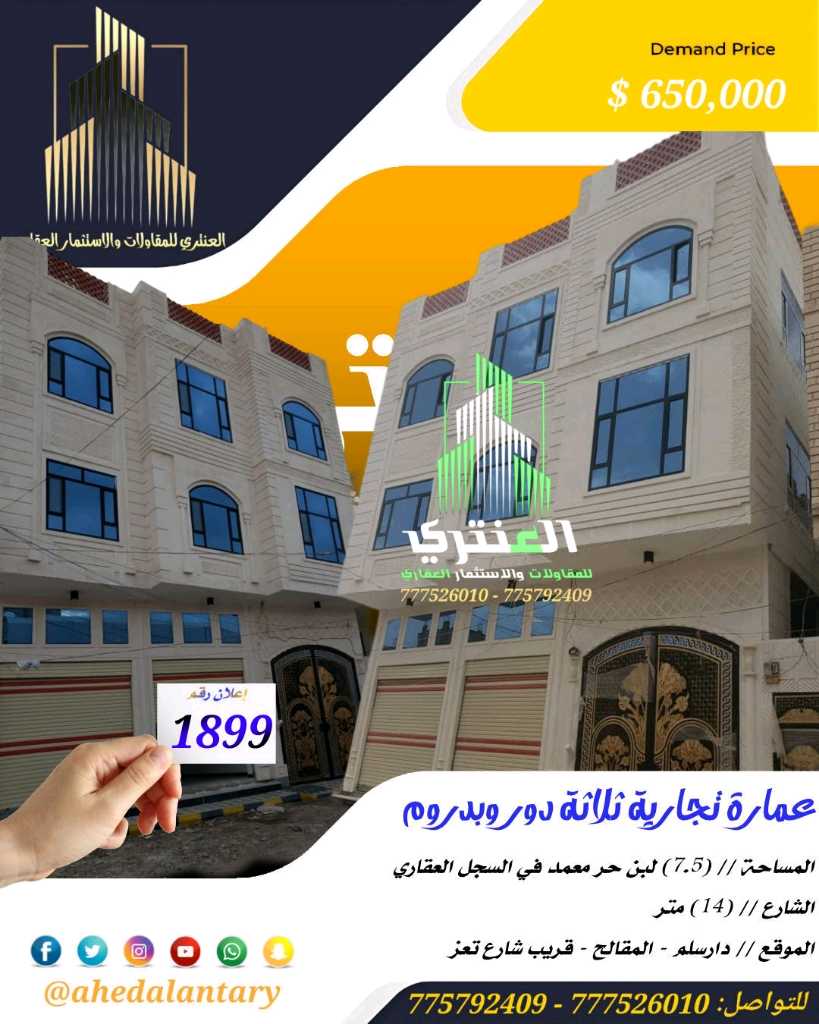 "نعطي اهتمام بالغ بالتطوير الدائم.. والارتقاء بجودة.. وتنوع خدماتها.. التي من شأنها تقديم الأفضل لعملائنا" نقدم لكم : عرض رقم (1899) عمارة تجارية ثلاثة دور وبدروم سوبر لوكس.. المساحة // (7.5) لبن حر معمد في السجل العقاري.. الشارع // (14) متر.. الموقع // دارسلم - المقالح.. السعر // (650,000 $) ستمائة وخمسين الف دولار قابل للتفاوض.. التفاصيل: عمارة تجارية ثلاثة دور وبدروم سوبر لوكس.. - البدروم يتكون من صالة مفتوحة ومطبخ وحمام.. - الدور الاول يتكون من فتحتين تجارية وجراش سيارة وخزان ارضي وشقة في الخلف تتكون من (جناح عائلي غرف نوم مع الحمام) و غرفتين وصالة طعام وحمام ومطبخ بمدخل عائلي ومجلس وحمام بمدخل مستقل.. - الدور الثاني يتكون من شقتين كل شقة تتكون من (جناح عائلي غرف نوم مع الحمام) و غرفتين وصالة طعام وحمام ومطبخ بمدخل عائلي ومجلس وحمام بمدخل مستقل.. - الدور الثالث نفس تصميم الدور الثاني.. 💫 صممت الأساسات لتحمل عدد ستة دور وطيرمانة.. 💫 عمل كامل درجة اولى.. 💫 بالإضافة إلى تشطيب سوبر لوكس.. 💫 بالإضافة إلى حي راقي جدا.. 💫 جميع المواد المستخدمة درجة أولى.. 💫 بالإضافة إلى خزان ارضي يتسع ل خمسة وايتات.. 💫 بالإضافة إلى جراش يتسع ل ثلاث سيارات.. 💫 بالإضافة إلى واجهة حجر.. 💫 بالإضافة إلى تهوية من جميع الجهات.. 💫 بالإضافة إلى اتجاه غربي.. 💫 بالاضافة الي موقع قريبة من جميع الخدمات.. 💫 توثيق كامل ( صور + فيديو ) لجميع مراحل العمل.. *وميزات اخرى ستتعرف عليها وستشاهدها عند زيارتك لها* """"""""""""""""""""""""""""""""""""""""" #العنتري_للمقاولات_والإستثمار_العقاري للتواصل: (777526010)📞 (775792409)📞