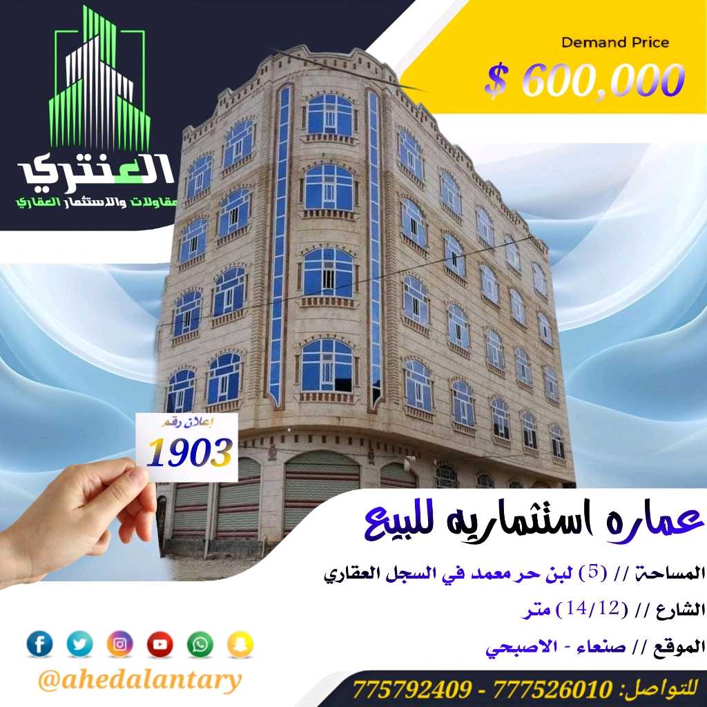 عرض رقم (1903) عماره استثماريه للبيع في منطقه الاصبحي عمل شخصي العماره مكونه من 5دور وملحق وطيرمانه 9 شقق ومحلات تجاريه وجراش ومدخل عايلي وملحق وطيرمانه المساحة // (5) لبن حر معمد في السجل العقاري.. الشارع // (14/12) متر.. الموقع // صنعاء - الاصبحي.. تم تخفيض السعر // (600,000 $) ستمائة ألف دولار.. للتواصل: (775792409)📞 (777526010)📞