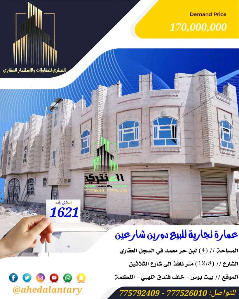 عرض رقم (1921) عمارة تجارية دورين شارعين ثلاث شقق وثلاث فتحات وجراش سيارة سوبر لوكس.. المساحة // (4) لبن حر معمد في السجل العقاري.. الشارع // (12/8) متر نافذ الى شارع الثلاثين.. الموقع // بيت بوس - خلف فندق اللهبي - اللكمة.. السعر // (160,000,000) مائة وستين مليون قابل للتفاوض.. التفاصيل: عمارة تجارية دورين شارعين ثلاث شقق وثلاث فتحات وجراش سيارة سوبر لوكس - الدور الأول يتكون من ثلاث فتحات تجارية وجراش سيارة وخزان ارضي وشقة في الخلف تتكون من غرفتين وصالة وحمام ومطبخ بمدخل عائلي ومجلس وحمام بمدخل مستقل. - الدور الثاني يتكون من شقتين كل شقة تتكون من غرفتين وصالة وحمام ومطبخ بمدخل عائلي ومجلس وحمام بمدخل مستقل. ⭐مميزاتها⭐ 💫 بالإضافة إلى خزان ارضي.. 💫 بالإضافة إلى حوش سيارة.. 💫 بالإضافة إلى تشطيبات سوبر لوكس.. 💫 بالإضافة إلى واجهتين حجر.. 💫 جميع المواد المستخدمة درجة أولى.. 💫 صممت الأساسات لتحمل عدد ستة دور وطيرمانة.. 💫 حي راقي جدا.. 💫 وجميع الاعمال موثقه من بداية الأعمال الإنشائية حتى آخر اللمسات.. *وميزات اخرى ستتعرف عليها وستشاهدها عند زيارتك لها* """""""""""""""""""""""""""""""""""""""" للتواصل ومعرفة المزيد من التفاصيل، يُرجى الاتصال على الرقم التالي: 775792409 777526010