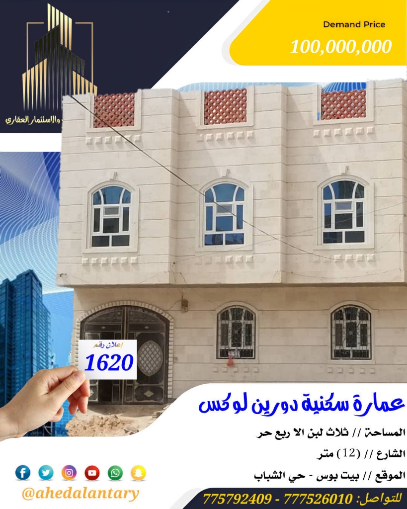 "لا تفوت الفرصة من بين يديك" .. عروض لا مثيل لها وبأفضل الاسعار .. كل ذلك من أجل توفير أفضل الخدمات لعملائنا.. عرض رقم (1920) عمارة سكنية دورين سوبر لوكس... المساحة // ثلاث لبن الا ربع حر.. الشارع // (12) متر.. الموقع // بيت بوس - حي الشباب.. السعر // (100,000,000) مائة مليون ريال.. التفاصيل: - الدور الأول يتكون من جراش سيارة وخزان ارضي وشقة تتكون من غرفتين وصالة وحمام ومطبخ بمدخل عائلي ومجلس وحمام بمدخل مستقل.. - الدور الثاني يتكون من ثلاث غرف وحمام وصالة كبيره بمدخل عائلي ومجلس مع الحمام بمدخل مستقل.. 💫 صممت الأساسات لتحمل عدد خمسة دور وملحق وطيرمانة.. 💫 جميع المواد المستخدمة درجة أولى.. 💫 بالإضافة إلى خزان ارضي يتسع ل خمسة وايتات.. 💫 بالإضافة إلى جراش سيارة.. 💫 بالإضافة إلى واجهة حجر.. 💫 بالإضافة إلى تهوية من جميع الجهات.. 💫 توثيق كامل ( صور + فيديو ) لجميع مراحل العمل.. *وميزات اخرى ستتعرف عليها وستشاهدها عند زيارتك لها* """"""""""""""""""""""""""""""""""""""""" للتواصل ومعرفة المزيد من التفاصيل، يُرجى الاتصال على الرقم التالي: 775792409 777526010
