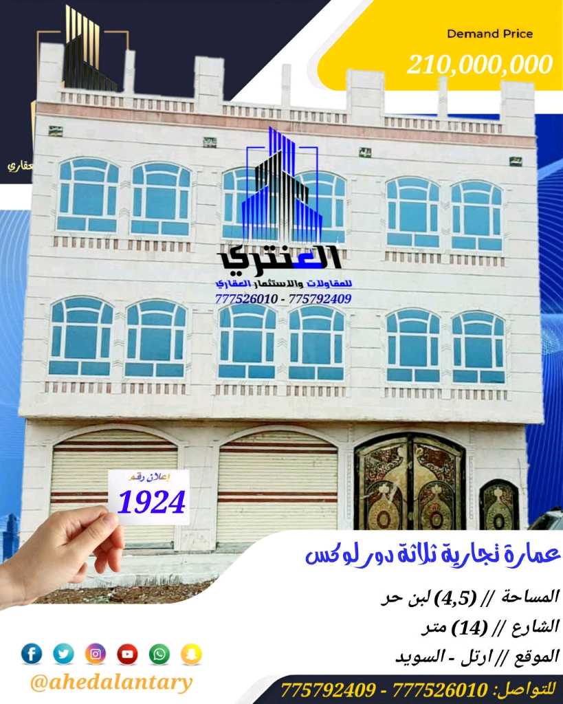 عرض رقم (1924) عمارة تجارية ثلاثة دور سوبر لوكس.. المساحة // (4,5) لبن حر.. الشارع // (14) متر.. الموقع // ارتل - السويد.. السعر // (210,000,000) مائتين وعشرة مليون ريال قابل للتفاوض.. التفاصيل: - الدور الاول يتكون من فتحتين تجارية وجراش سيارة وخزان ارضي وشقة في الخلف تتكون من غرفتين وصالة استقبل بمقام غرفة وحمام ومطبخ بمدخل عائلي ومجلس وحمام بمدخل مستقل.. - الدور الثاني يتكون من شقتين كل شقة تتكون من غرفتين وصالة استقبل بمقام غرفة وحمام ومطبخ بمدخل عائلي ومجلس وحمام بمدخل مستقل.. - الدور الثالث نفس تصميم الدور الثاني.. ⭐مميزاتها⭐ 💫 تشطيبات ديلوكس في قمة الرووعة والجمال .. 💫 صممت الأساسات لتحمل عدد خمسة دور وطيرمانة.. 💫 عمل كامل درجة اولى.. 💫 بالإضافة إلى موقع ذهبي.. 💫 جميع المواد المستخدمة درجة أولى.. 💫 بالإضافة إلى خزان ارضي يتسع ل أربعة وايتات.. 💫 بالإضافة إلى بلاط سراميك.. 💫 بالإضافة إلى واجهة حجر.. 💫 توثيق كامل ( صور + فيديو ) لجميع مراحل العمل.. *وميزات اخرى ستتعرف عليها وستشاهدها عند زيارتك لها* """"""""""""""""""""""""""""""""""""""""" #العنتري_للمقاولات_والإستثمار_العقاري للتواصل: (777526010)📞 (775792409)📞 لمتابعة جميع عروضنا عبر صفحتنا على منصة الفيس بوك: https://www.facebook.com/antri.ye/ وللتواصل عبر الواتس مباشرة يرجى الضغط على الرابط التالي... https://wa.me/967775792409 للحصول على كل جديد في عالم العقارات تابعنا على قناة الواتساب.. https://whatsapp.com/channel/0029Va8yDxWGZNCzotxGlr1U رابط قناتنا على: youtube https://youtube.com/@ahedalantary 🔴 تنويه لعملائنا الكرام ومتابعينا الأعزاء يوجد لدينا مخزون هائل من العروض العقارية للفل والعمائر التجارية والمزارع والأرضي الإستثمارية العملاقة. 🔴 ملاحظة: جميع عقاراتنا من الملاك رأسا. 🔴 ملاحظة: الأسعار تتغير نتيجة لتفاوت أسعار الصرف والوضع الاقتصادي للبلد. 🌐🌐🌐🌐🌐🌐🌐🌐🌐🌐🌐🌐🌐🌐🌐🌐🌐🌐🌐