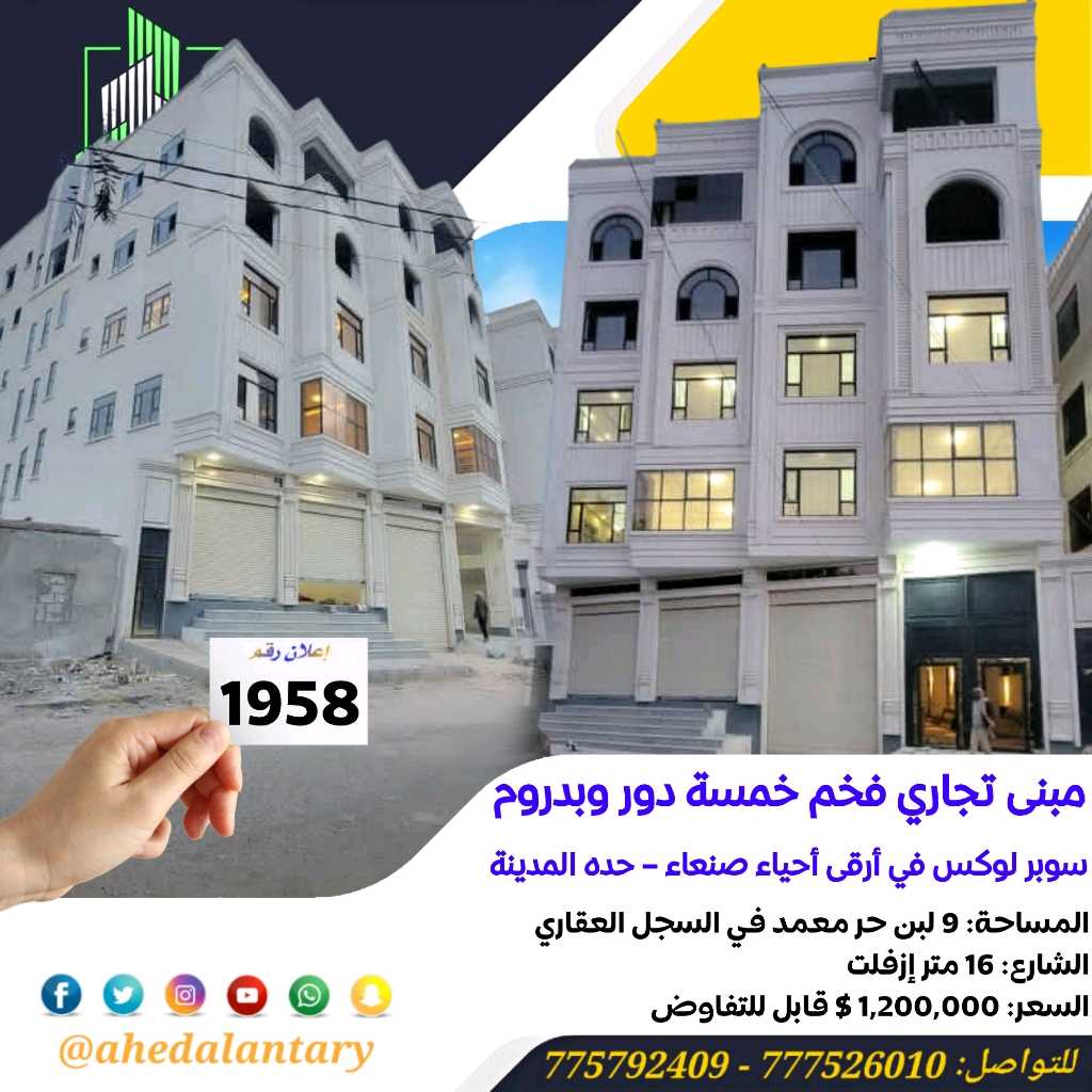 عرض رقم (1958) مبنى تجاري خمسة دور وبدروم سوبر لوكس.. المساحة // (9) لبن حر معمد في السجل العقاري.. الشارع // (16) متر إزفلت.. الموقع // صنعاء - حده المدينة.. السعر // (1,200,000 $) مليون ومائتين الف دولار قابل للتفاوض.. التفاصيل: مبنى تجاري ستة دور مع البدروم سوبر لوكس.. - البدروم صالة مفتوحه كبيره بالاضافة إلى موقف للسيارات تدخل السياراه بالراحه فية.. - الدور الأول يتكون من فتحتين تجارية ومدخل سيارة للبدروم وجراش للسيارات وشقة كبيره في الخلف تتكون من(جناح عائلي غرف نوم مع الحمام) وثلاث غرف وصالة ومطبخ وحمام وصالة جانبية واسعه بمدخل عائلي ومجلس وحمام بمدخل مستقل.. - الدور الثاني يتكون من شقتين كبار بنظام فلة كل شقة تتكون من (جناح عائلي غرف نوم مع الحمام) وغرفتين وصالة ومطبخ وحمام وصالة جانبية واسعه بمدخل عائلي ومجلس وحمام بمدخل مستقل.. - الدور الثالث والرابع والخامس نفس تصميم الدور الثاني.. 💫 صممت الأساسات لتحمل عدد ستة دور وملحق وطيرمانة.. 💫 💫 الاوراق معمدة وموثقة في السجل العقاري.. 💫 عمل كامل درجة اولى.. 💫 الموقع ارقئ واجمل الاحياء الراقي والجميلة في امانة العاصمة.. 💫 بالإضافة إلى خزان ارضي يتسع ل خمسة وايتات.. 💫 بالإضافة إلى تهوية من جميع الجهات.. 💫 بالإضافة إلى جراش سيارة.. 💫 بالإضافة إلى واجهة حجر.. 💫 توثيق كامل ( صور + فيديو ) لجميع مراحل العمل.. *وميزات اخرى ستتعرف عليها وستشاهدها عند زيارتك لها* """"""""""""""""""""""""""""""""""""""""" #عقارات_عاهد_العنتري_للمقاولات_والاستثمار_العقاري #يمن_العقارية للتواصل: (777526010)📞 (775792409)📞 لمتابعة جميع عروضنا عبر صفحتنا على منصة الفيس بوك: https://www.facebook.com/antri.ye/ وللتواصل عبر الواتس مباشرة يرجى الضغط على الرابط التالي... https://wa.me/967775792409 للحصول على كل جديد في عالم العقارات تابعنا على قناة الواتساب.. https://whatsapp.com/channel/0029Va8yDxWGZNCzotxGlr1U رابط قناتنا على: youtube https://youtube.com/@ahedalantary 🔴 تنويه لعملائنا الكرام ومتابعينا الأعزاء يوجد لدينا مخزون هائل من العروض العقارية للفل والعمائر التجارية والمزارع والأرضي الإستثمارية العملاقة. 🔴 ملاحظة: جميع عقاراتنا من الملاك رأسا. 🔴 ملاحظة: الأسعار تتغير نتيجة لتفاوت أسعار الصرف والوضع الاقتصادي للبلد. 🌐🌐🌐🌐🌐🌐🌐🌐🌐🌐🌐🌐🌐🌐🌐🌐🌐🌐🌐