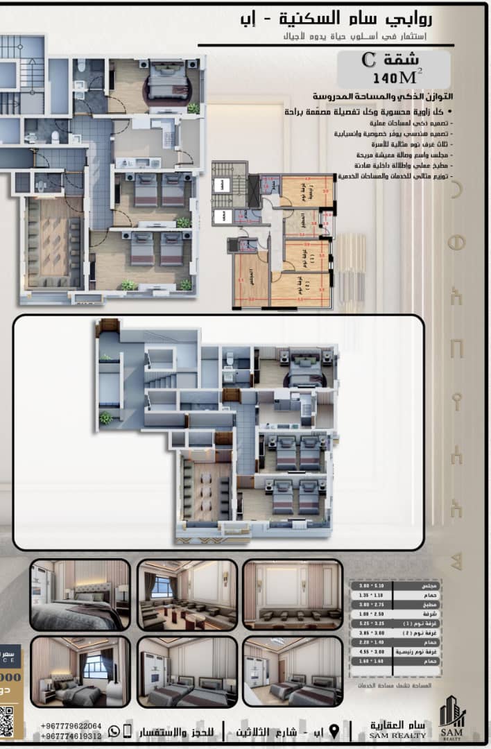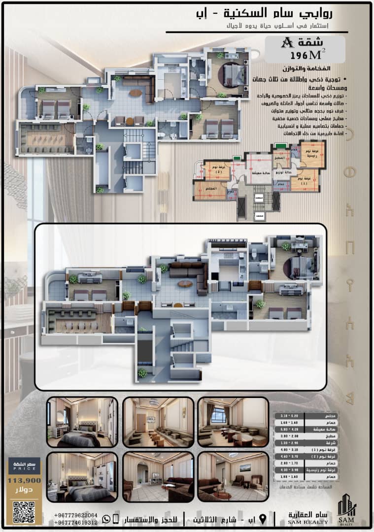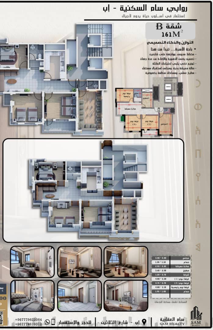 شقق تمليك فاخرة في محافظة إب، بموقع استراتيجي مميز وواجهة على شارعين، مع تصميم داخلي ذكي يضمن التهوية والإضاءة الطبيعية والخصوصية. المساحات المتاحة: - شقة C: 140 متر مربع - شقة B: 161 متر مربع - شقة A: 196 متر مربع - شقة E: 235 متر مربع - شقة D: 274 متر مربع تضم الشقق صالة معيشة رحبة، ومجلس استقبال مستقل، ومطبخ عملي. فرصة استثمارية وسكنية مميزة.