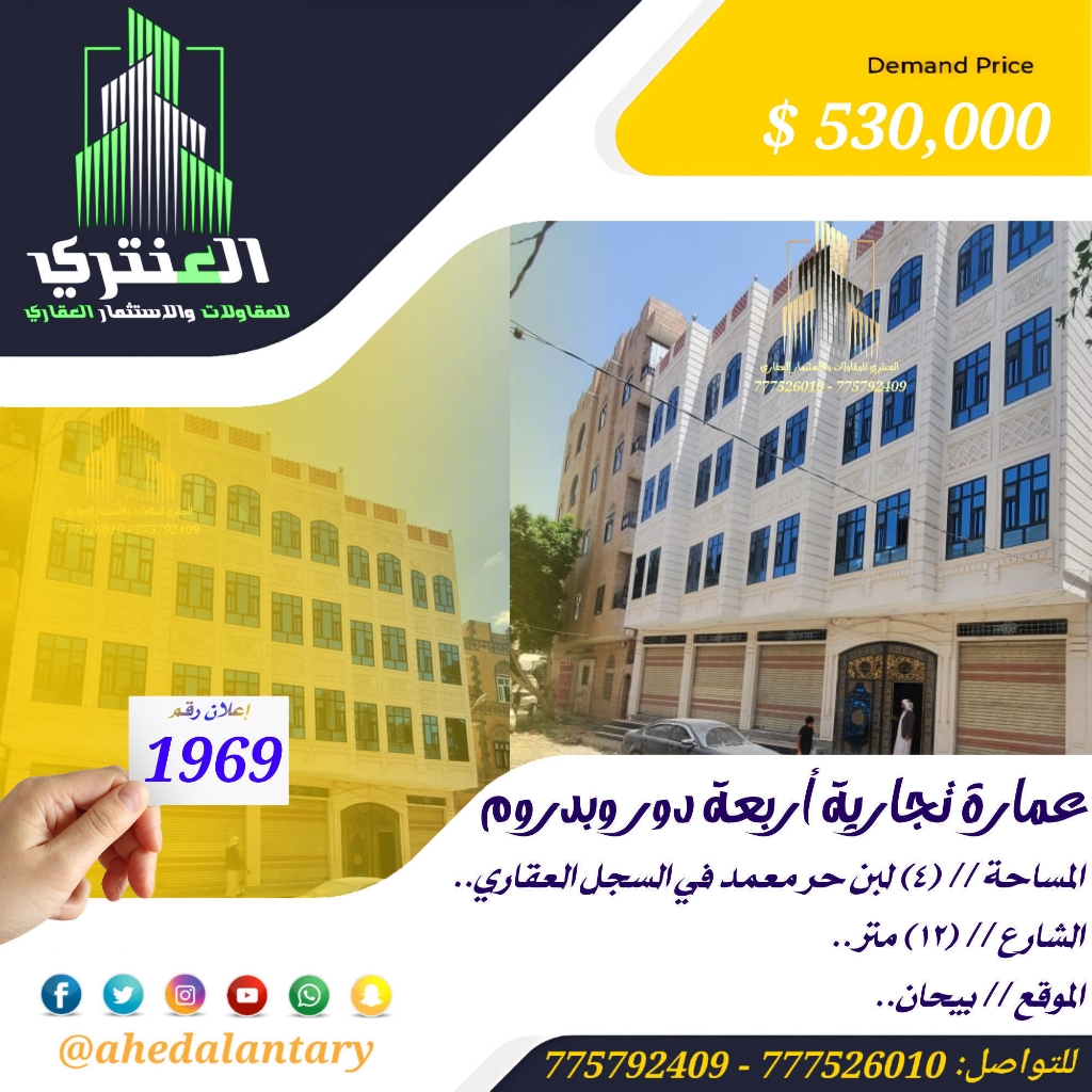 شعارنا ..ثقة - ربح - أمان .. وكما وعدناكم بمفاجآت عديدة خلال وتلبية لاحتياجاتكم ورغباتكم، نقدم لكم: عرض رقم (1969) عمارة تجارية أربعة دور وبدروم... المساحة // (4) لبن حر معمد في السجل العقاري.. الشارع // (12) متر.. الموقع // بيحان.. السعر // (530,000 $) خمسمائة وثلاثين الف دولار قابل للتفاوض.. التفاصيل: عمارة تجارية أربعة دور وبدروم... - البدروم مفتوح كامل مع حمام.. - الدور الاول يتكون من اربع فتحات تجارية وجراش سيارة وخزان ارضي وشقة في الخلف تتكون من غرفتين وصالة وحمام ومطبخ بمدخل عائلي ومجلس وحمام بمدخل مستقل.. - الدور الثاني يتكون من شقتين كل شقة تتكون من غرفتين وصالة وحمام ومطبخ بمدخل عائلي ومجلس وحمام بمدخل مستقل.. - الدور الثالث والدور الرابع نفس تصميم الدور الثاني.. *مميزاتها* *💫 صممت الأساسات لتحمل عدد ستة دور وملحق وطيرمانة..* *💫 بالإضافة إلى واجهة حجر..* *💫 جميع المواد المستخدمة درجة أولى..* *💫 بالإضافة إلى خزان ارضي يتسع ل خمسة وايتات..* *💫 إلى جراش واسع للسيارات..* *💫 بالإضافة إلى *💫 كما انها قريبة جدآ من *💫 توثيق كامل ( صور + فيديو ) لجميع مراحل العمل..* *وميزات اخرى ستتعرف عليها وستشاهدها عند زيارتك لها* """"""""""""""""""""""""""""""""""""""""" #عقارات_عاهد_العنتري_للمقاولات_والاستثمار_العقاري للتواصل: (777526010)📞 (775792409)📞 لمتابعة جميع عروضنا عبر صفحتنا على منصة الفيس بوك: https://www.facebook.com/antri.ye/ وللتواصل عبر الواتس مباشرة يرجى الضغط على الرابط التالي... https://wa.me/967775792409 رابط قناتنا على: youtube https://youtube.com/@ahedalantary 🔴 تنويه لعملائنا الكرام ومتابعينا الأعزاء يوجد لدينا مخزون هائل من العروض العقارية للفل والعمائر التجارية والمزارع والأرضي الإستثمارية العملاقة. 🔴 ملاحظة: جميع عقاراتنا من الملاك رأسا. 🔴 ملاحظة: الأسعار تتغير نتيجة لتفاوت أسعار الصرف والوضع الاقتصادي للبلد. 🌐🌐🌐🌐🌐🌐🌐🌐🌐🌐🌐🌐🌐🌐🌐🌐🌐🌐🌐